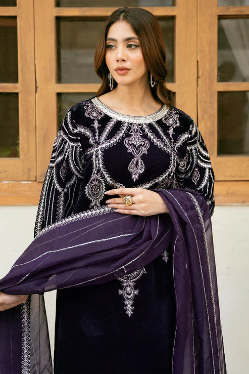 This breathtaking silk outfit is a customer favorite, featuring a short purple shirt with intricate white embroidery and a beautifully cut hem. It’s paired with a plain purple farshi shalwar, adding a traditional flair. The net dupatta has delicate white embroidery and a slim silver border, while the embroidered sleeves and white tassels give the outfit a luxurious touch.