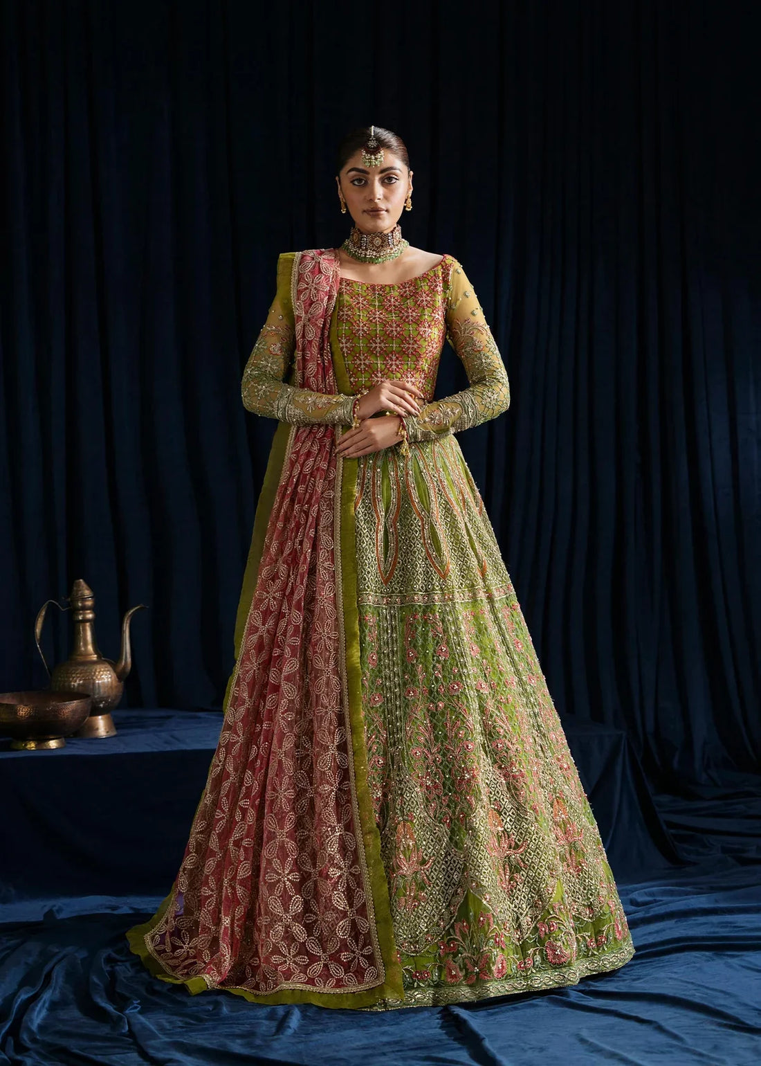 Description : This exquisite pishwas features intricate embroidery cascading across the entire gown, blending tradition...