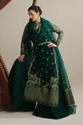 An opulent deep green outfit featuring a heavily embellished long shirt with intricate gold threadwork and bead detailing. Paired with a voluminous lehenga-style sharara and a matching sheer dupatta. This look exudes old-world charm with a contemporary silhouette — perfect for making a grand festive statement