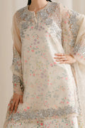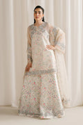 Ethereal charm meets modern festivity — the ivory shirt shimmers with silver handwork while the flowing trouser mirror the same artisanal detailing along the hem. Paired with a pearl-trimmed organza dupatta.This look glows with quiet opulence from head to hem