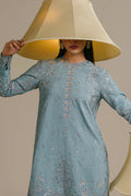 A cool powder blue ensemble featuring a straight shirt with a delicate keyhole at the back, paired with pleated trouser both adorned with silver embroidery. The minimal silhouette, enhanced by intricate detailing along the hem and sleeves, makes this look a perfect blend of understated elegance and festive charm
