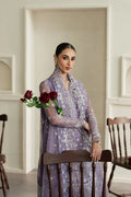 This lilac ensemble in net and organza is richly adorned with silver embroidery and sequins that shimmer with elegance. The long shirt features a delicate V-neckline and sheer embroidered sleeves, paired with a flowy tonal silk sharara and an embroidered scalloped dupatta. Exuding regal femininity, this look is perfect for weddings, receptions, or grand evening celebrations.
