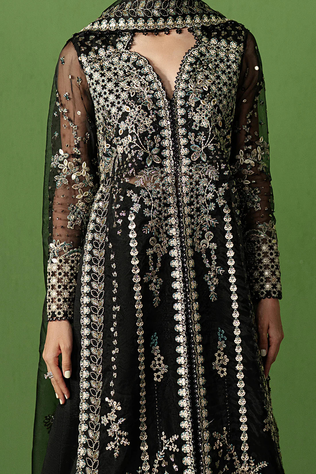 This striking black ensemble is a vision of timeless sophistication, crafted on sheer net fabric and lavishly adorned with silver and ivory embroidery that glimmers with regal allure. The structured bodice flows into a voluminous flared silhouette, while the intricately detailed sheer sleeves add a touch of modern elegance. Paired with a coordinating dupatta edged in ornate embellishments, this ensemble radiates grandeur, making it perfect for weddings and festive soirées