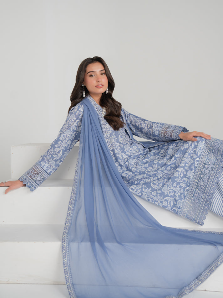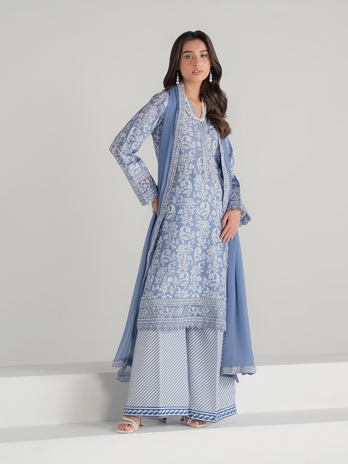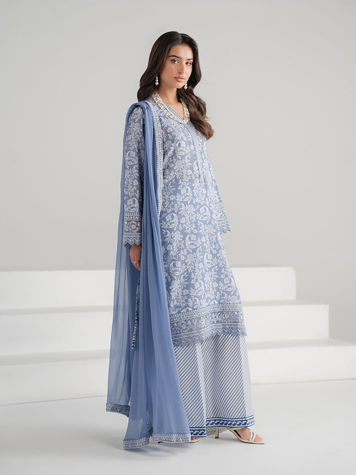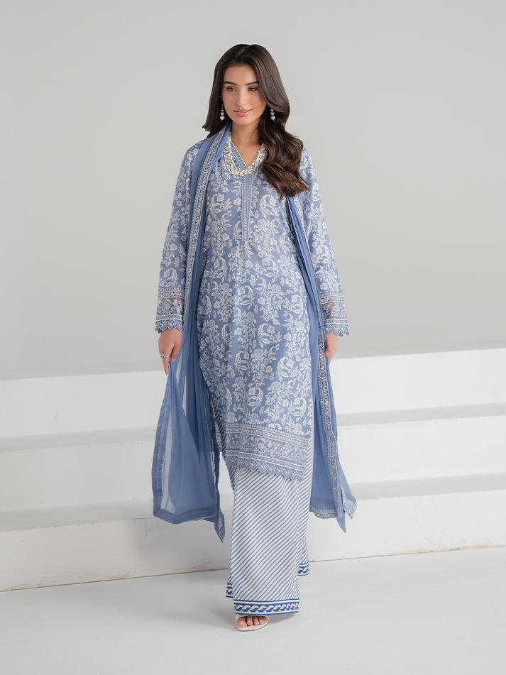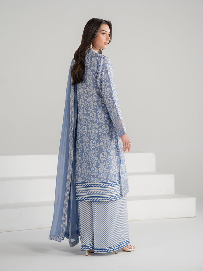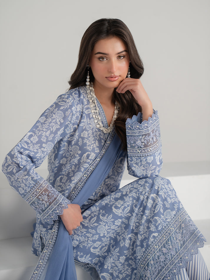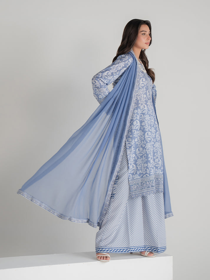 A refreshing blue printed lawn ensemble featuring a beautifully designed shirt and matching trouser. Paired with a lightweight chiffon dupatta that adds a soft, graceful finish. Perfect for effortless everyday elegance.