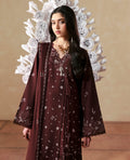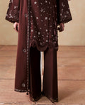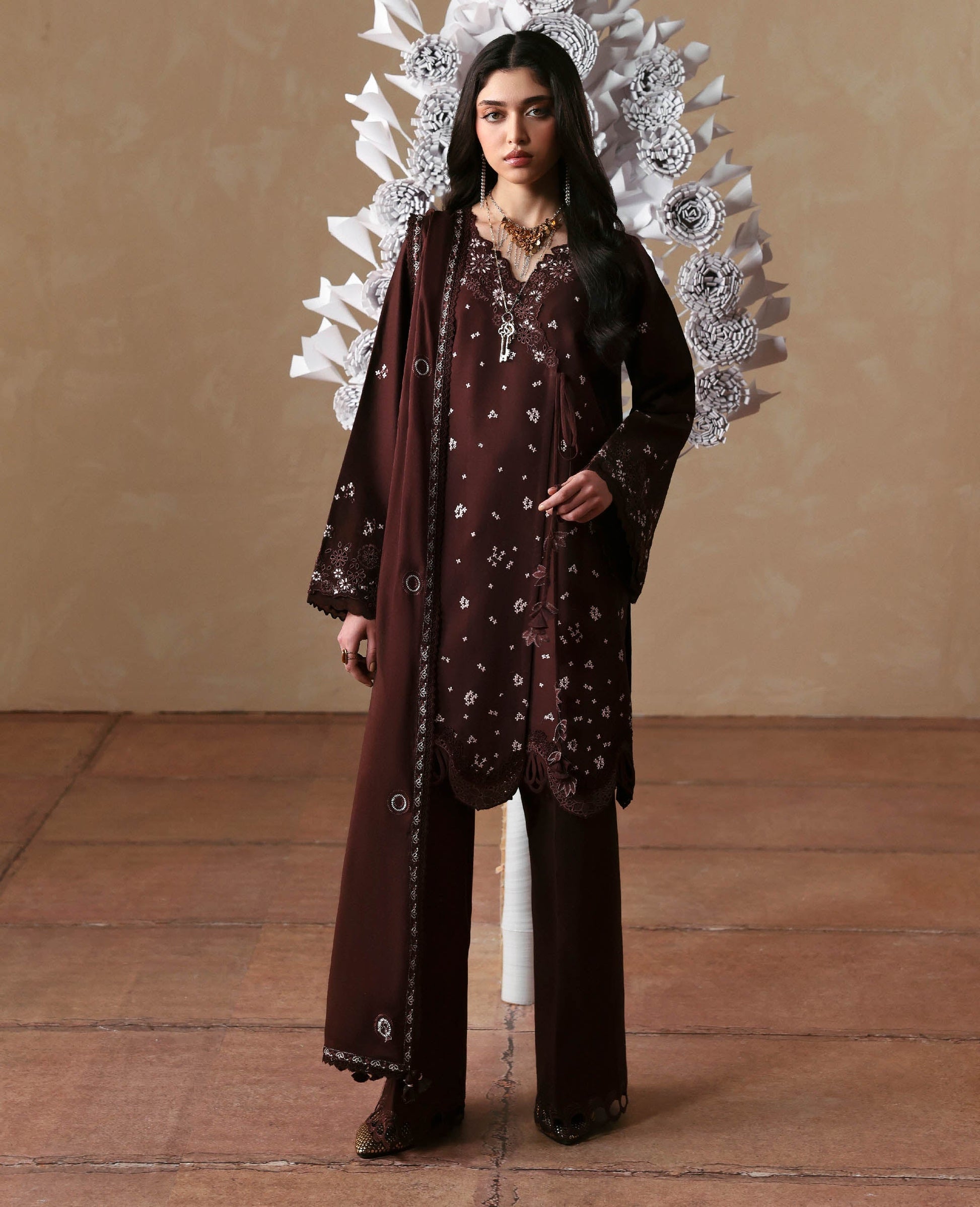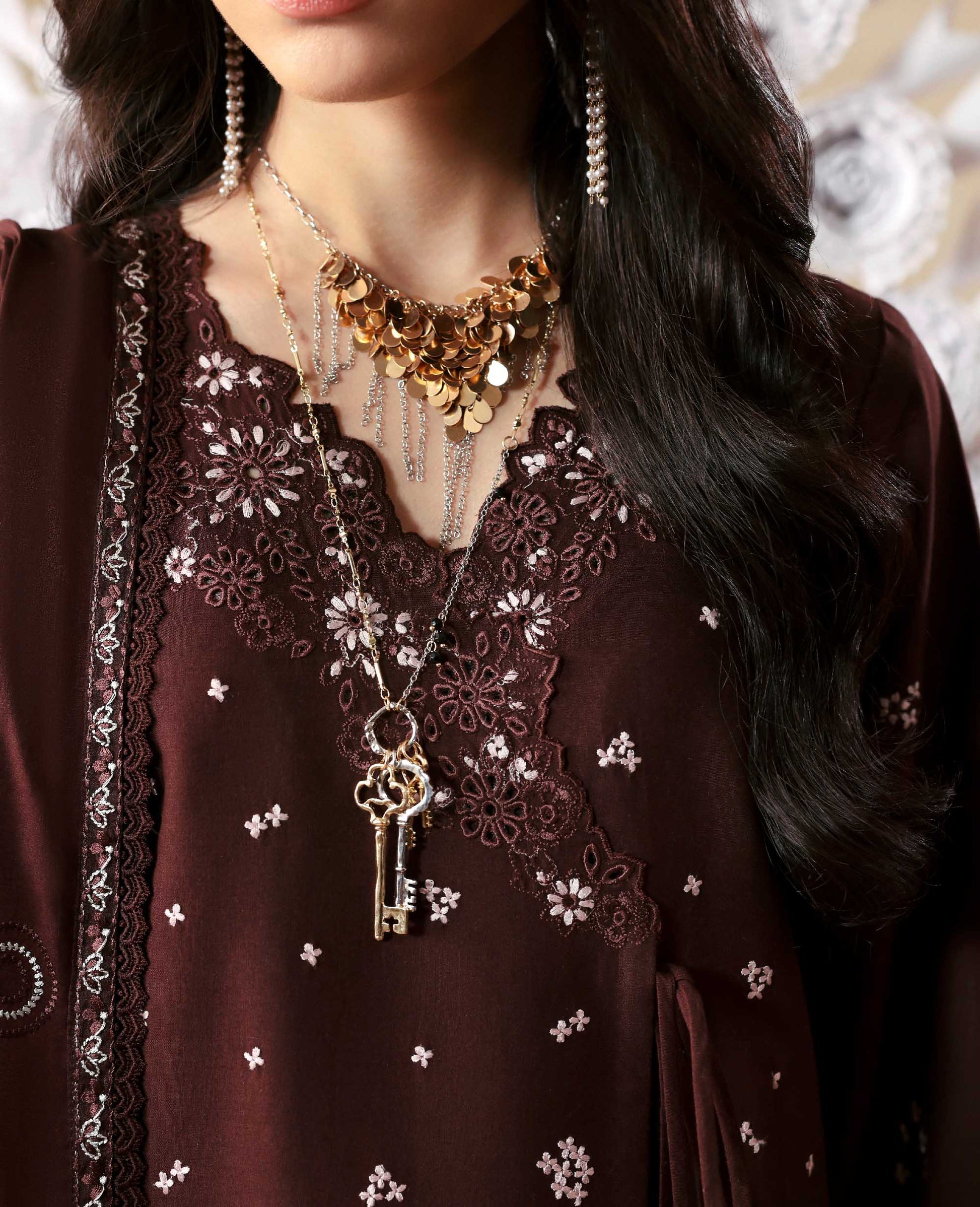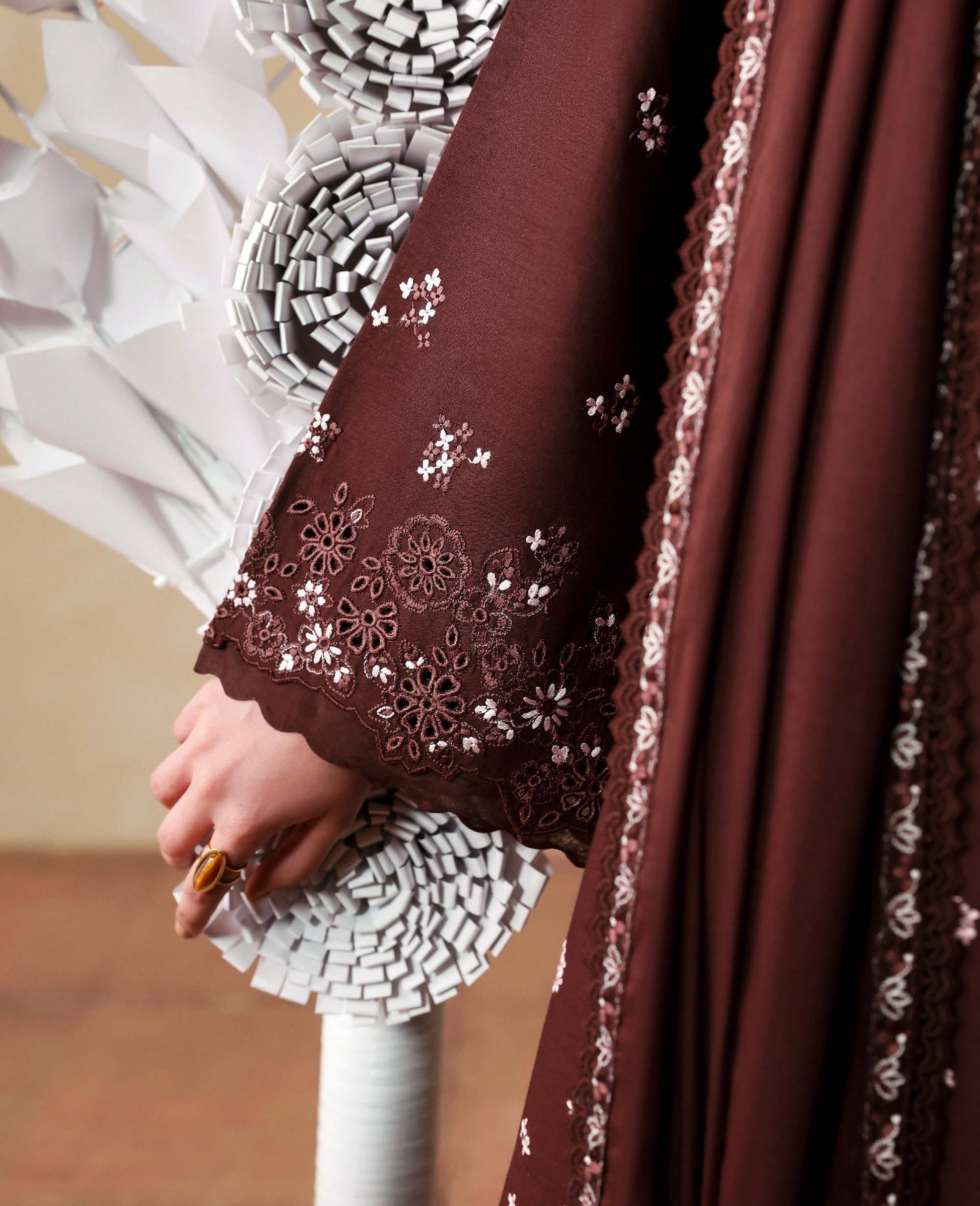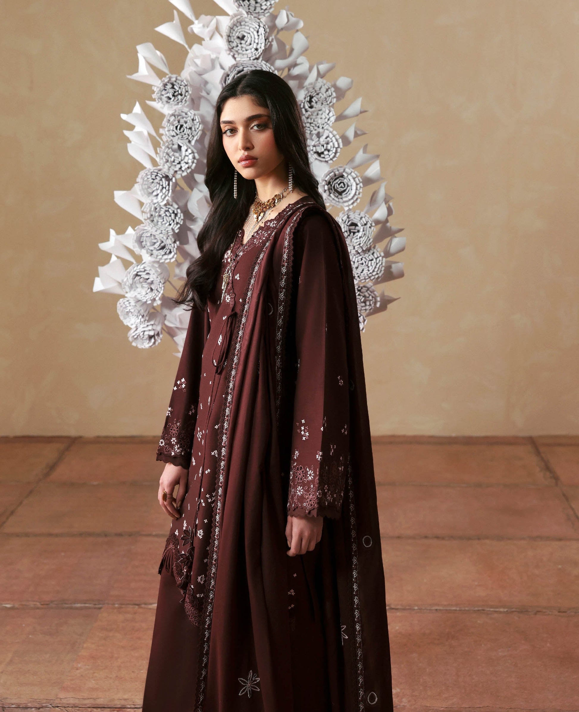 Cocoa is a deep, indulgent Chocolate Brown designed angrakha silhouette, finished with elegant dori tassels that add fluidity and artisanal charm. Delicate boring accents trace the neckline, sleeves, and hem, bringing subtle texture while keeping the look light and summer-ready. Styled with wide-leg cambric culottes, subtly enhanced with embroidered detailing at the hem for a polished finish, and completed with an airy voile dupatta featuring a refined accent hue for a graceful pop of contrast.