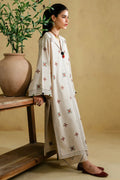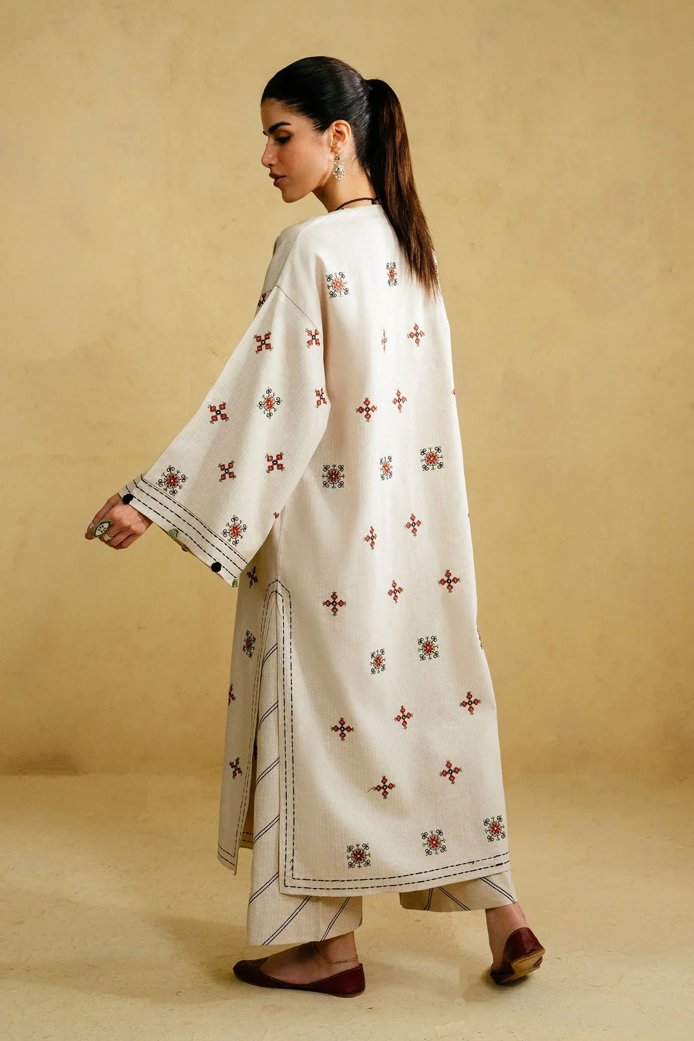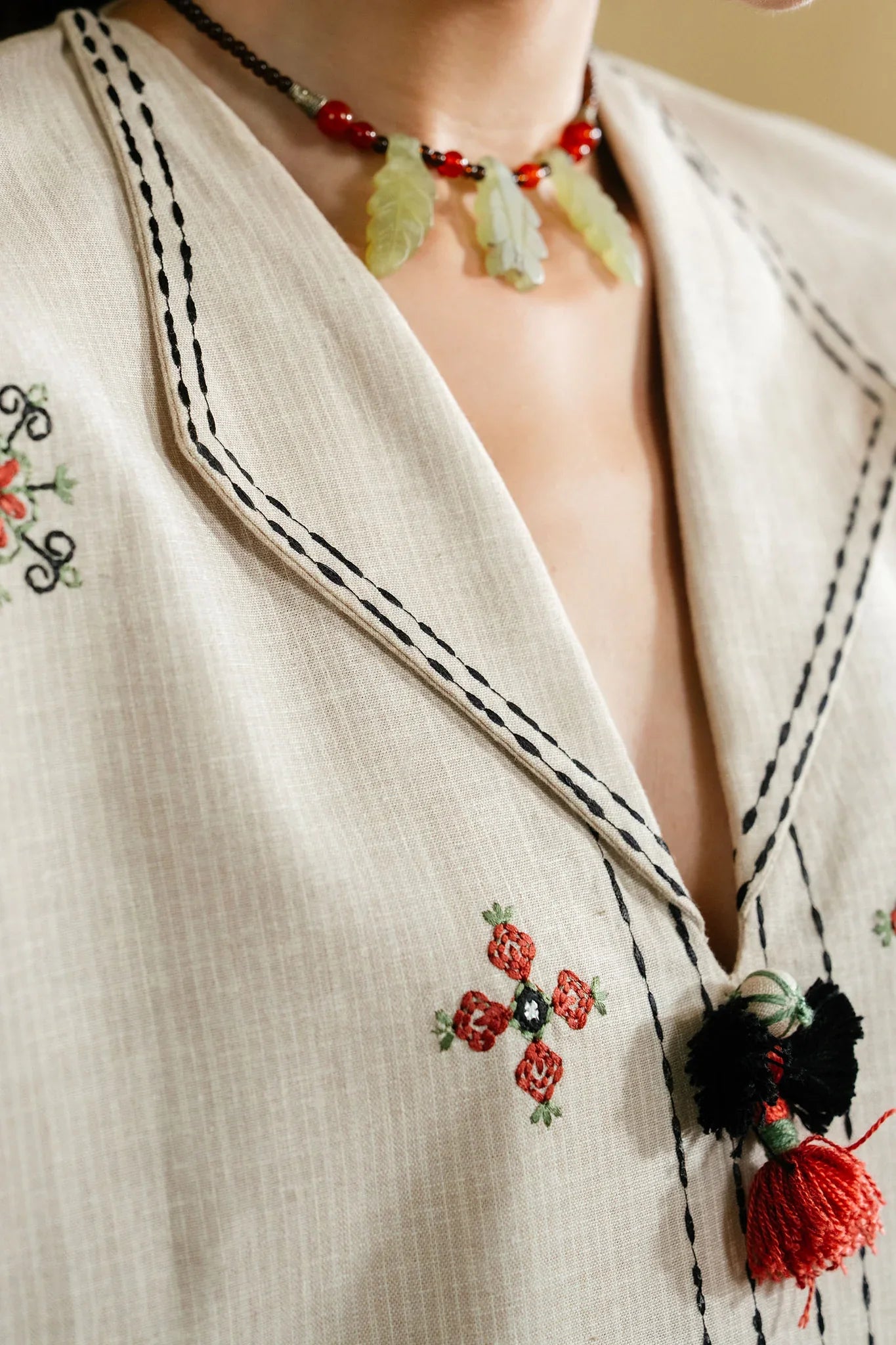 A serene, cream-colored striped yarn-dyed Irish linen forms the canvas for this ethereal ensemble. Topstitching in soft sage green traces gentle patterns across the fabric, punctuated with delicate mirror accents that catch the light with quiet elegance. The neckline is adorned with intricate black-stitched details, complemented by a playful pom-pom tassel that dances with every movement. The shirt is finished with refined stitchwork, harmonizing with embroidered trousers to create a look that is at once delicate, whimsical, and effortlessly autumnal — a statement of soft sophistication for the season.
