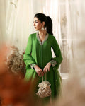 Inspired by heritage design and crafted with luxurious finishes, Elodie imbues timeless grace. Crafted from supple Raw Silk, the Kelly Green shirt features opulently ornamented motifs of naqshi, cut dana and pearls showcasing. Paired with an embellished organza dupatta and flared pants, this piece showcases impeccable artistry and standout style that shines a spotlight on you