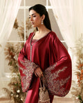 Designed to leave a lasting impression, Maelys intertwines regal craftsmanship with poised tailoring. Cut from a vibrant wine red Raw Silk, the kaftan features bedazzling sequins, pitta and resham work fused together in intricate patterns. With its statement silhouette and eye-catching details, this piece is a must have for your festive wardrobe