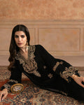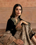 Capturing the true essence of timeless crafts, Vita showcases opulence and artistic flair. Crafted on black velvet, the shirt and trousers feature a majestic web of floral motifs wrought using tilla and resham stitches. Adding a layer of refinement and visual interest to the outfit is a dazzling spray of mirror work. This set includes a contrasting ivory embroidered shawl, making it a versatile addition to your festive wardrobe