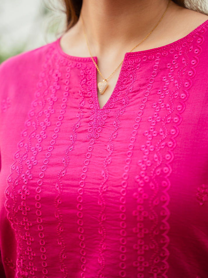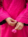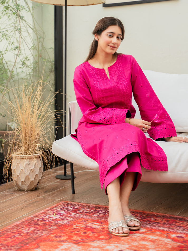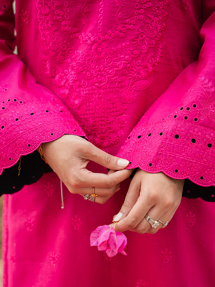 Floria is a statement two-piece set in a striking fuchsia pink base, crafted from premium lawn. The shirt is fully embroidered, showcasing intricate detailing that exudes timeless elegance. Chikankari embroidered lawn borders on the shirt and sleeves lend an artisanal touch, enhancing the richness of the design. Paired with a complementing cotton trouser, Floria is the perfect blend of vibrant charm and refined sophistication.