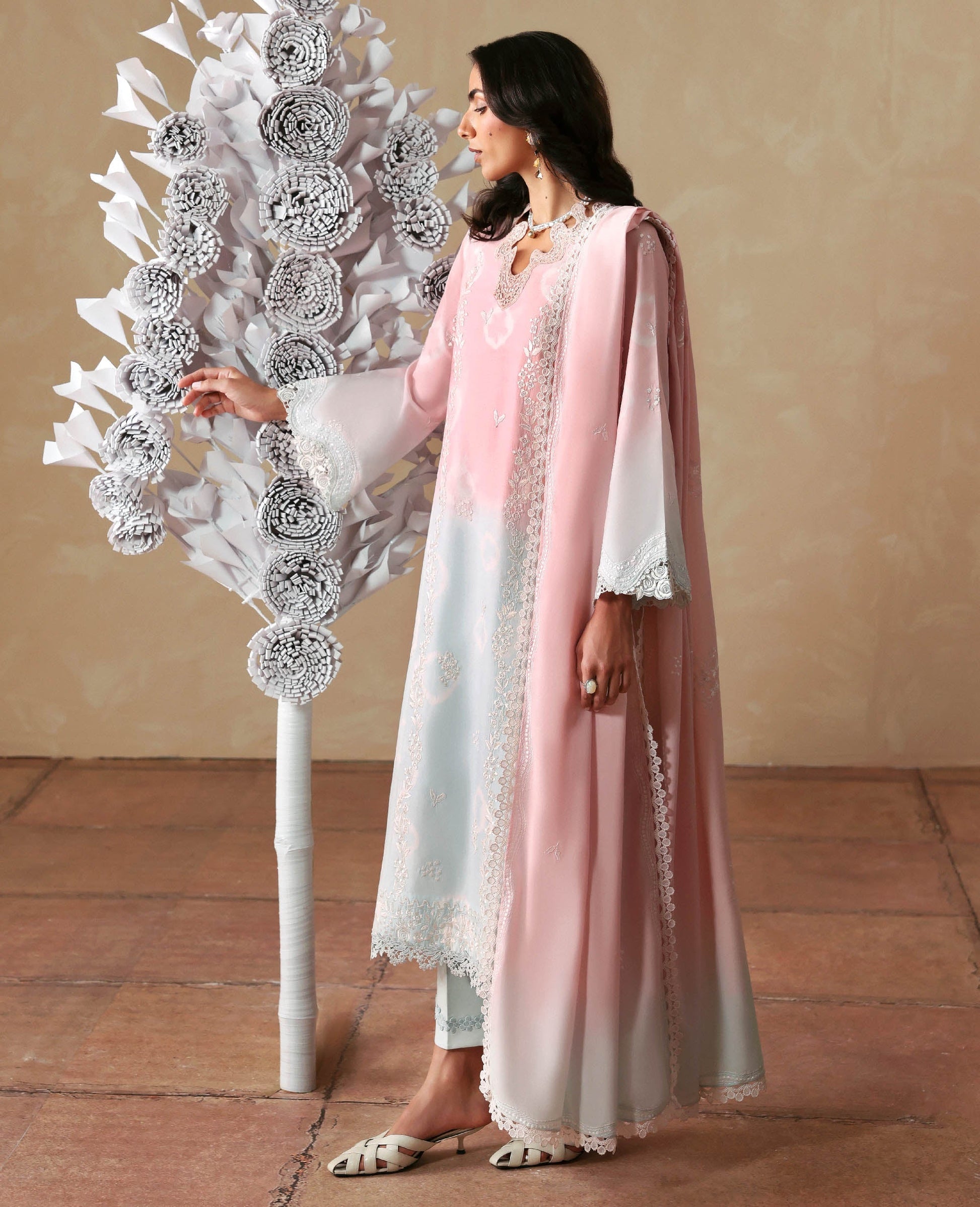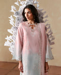 A dreamy Ice Blue two toned soft, summery ensemble featuring delicate parsigarah-inspired embroidery and intricate detailing on a breezy lawn shirt. Paired with beautifully detailed trousers and finished with a voile dupatta with a subtle gradient print, creating a fresh and effortlessly elegant look.
