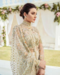 Cher - a classic front open shirt giving us a fairytale vibe embracing the pale soft green pallete with pretty shades of peach, white and green. The outfit is based on a beautiflly composed composition encrusted with gold shining hand embellished materials making it elegant and graceful. It is paired with a zari tissue sharara and the dupatta is exquisitely star studded with an extravagant spray of gold sequins.?
