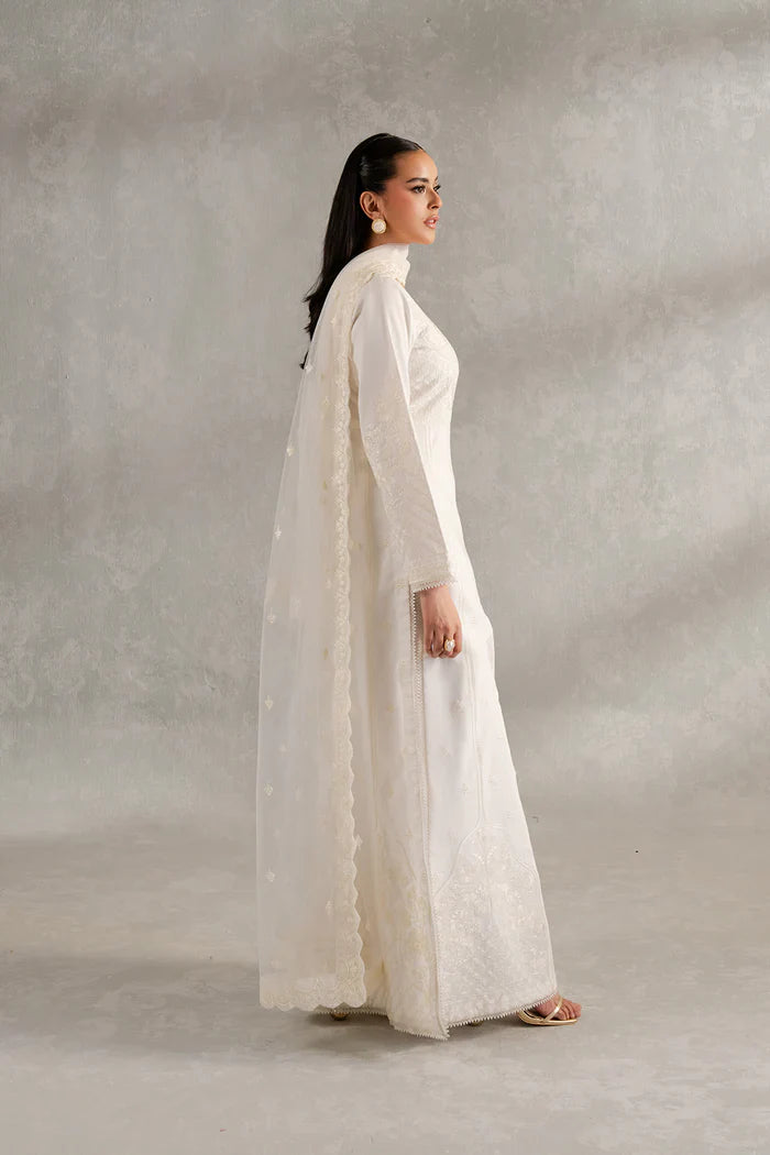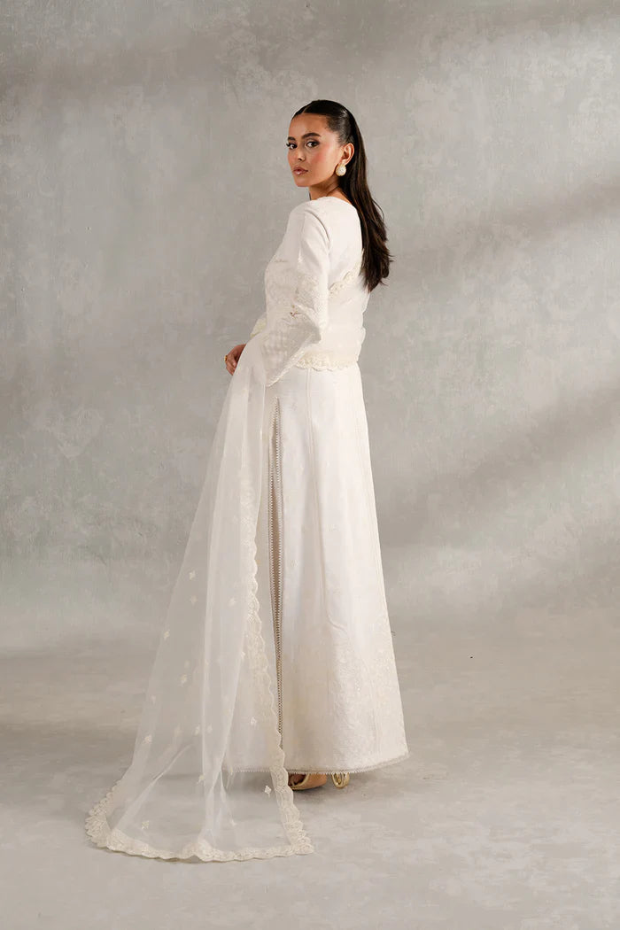 Embrace timeless grace in this elegant White 3-piece pret ensemble, crafted from airy lawn and designed to make a statement. The A-line paneled shirt features delicate embroidery and intricate lace detailing, beautifully framed by a refined keyhole neckline. Fitted sleeves with embroidered accents and lace trims add a touch of artisanal charm. Paired with classic straight trousers in cambric cotton for a sleek, polished look. The ethereal net dupatta steals the spotlight with an all-over embroidery spray and four-sided embroidered borders, bringing fluid movement and soft romance. A perfect fusion of modern tailoring and traditional elegance.