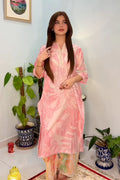 Embrace soft elegance in this beautiful 2-piece pret in a charming Ballerina shade. The printed lawn shirt features a graceful crew neckline with delicate pearl detailing that adds just the right touch of femininity. Quarter sleeves are enhanced with organza accents, bringing subtle texture to the overall look. The long silhouette pairs effortlessly with flared contrast trousers, adding a playful yet refined twist. Light, breathable, and thoughtfully detailed—perfect for a daytime gathering or a breezy summer outing.