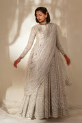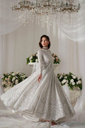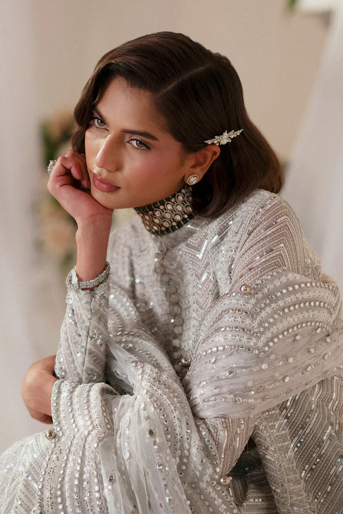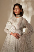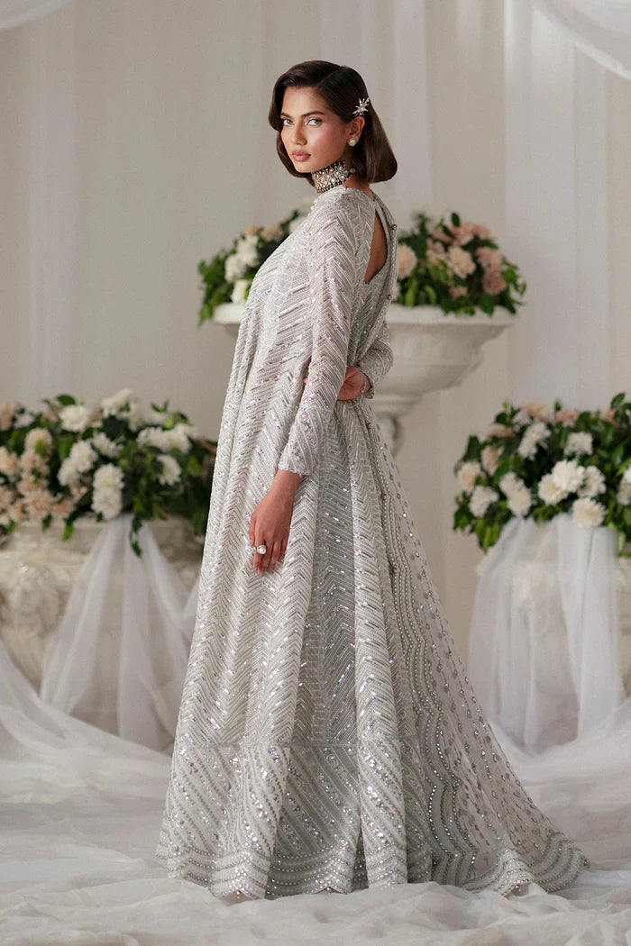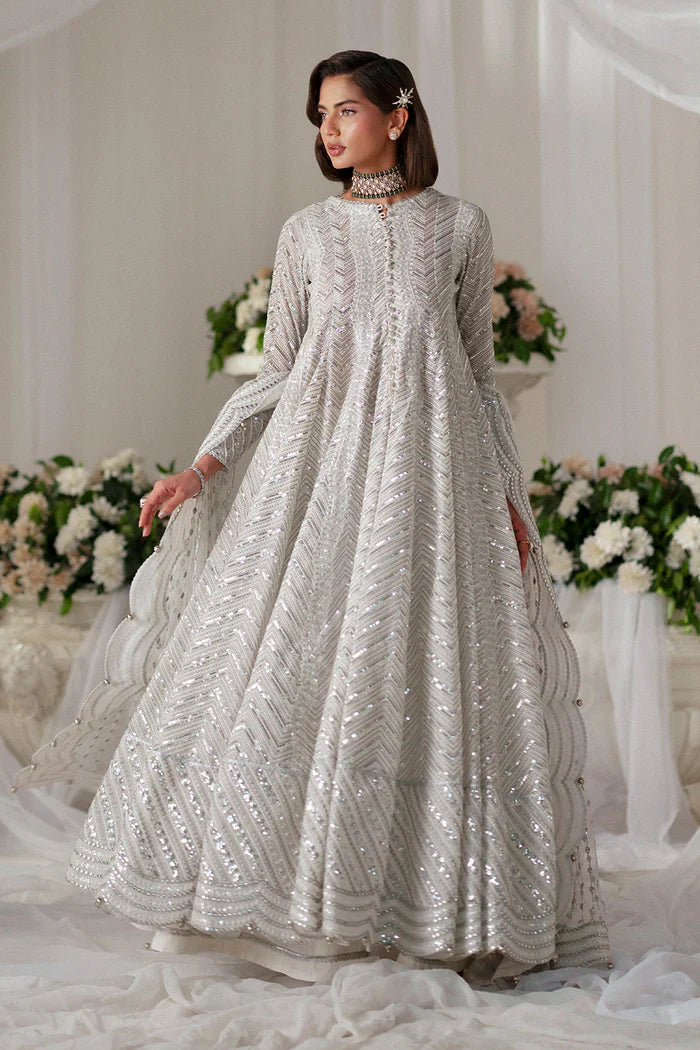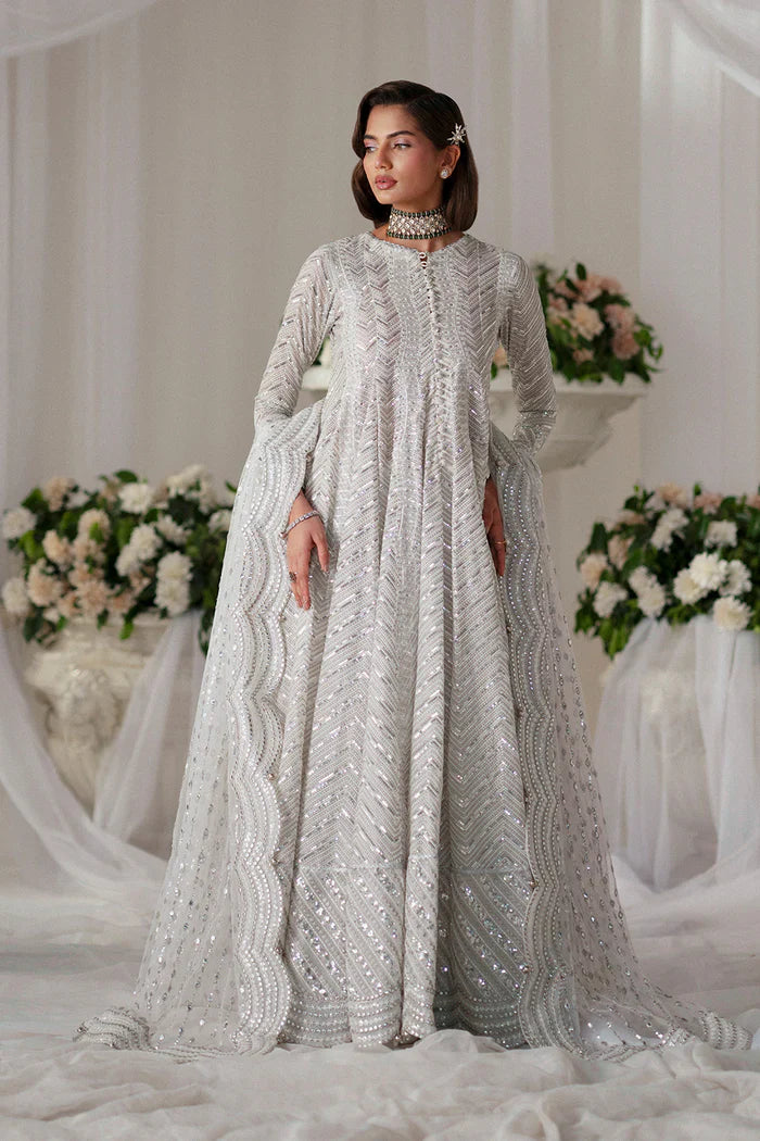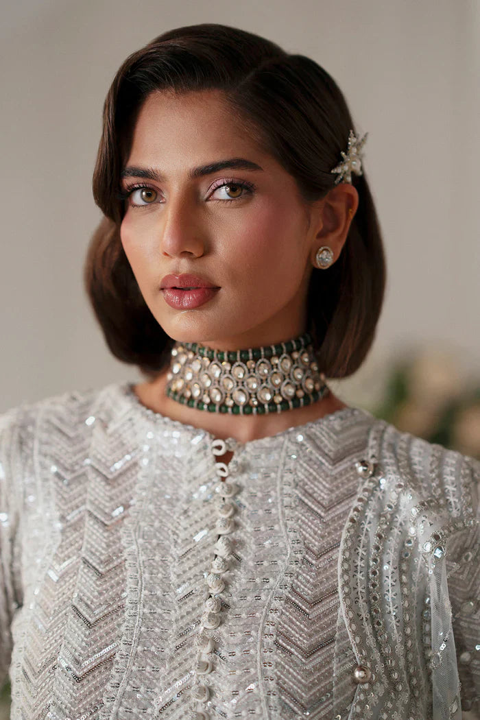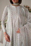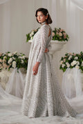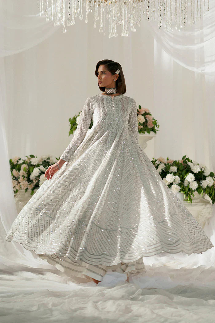 Grace your wardrobe with the ethereal charm of this Snow White 3-piece pret, featuring a full-length flared peshwas-style gown in sheer organza. The boat neckline with a subtle slit is adorned with lace finishing, fabric loops, and embroidered button detailing for a refined touch. Intricately designed with all-over chevron embroidery, the gown is further embellished with sequins, creating a luminous effect. The hemline continues the embroidery in graceful patterns, finished with a scalloped edge for timeless elegance. Fitted sleeves with full embroidery enhance the regal silhouette. Paired with straight grip trousers for a sleek balance, this ensemble is completed with a delicate net dupatta, finished with four-sided scalloped embroidered borders and scattered sequins. A lining is included for effortless wear, making this outfit a masterpiece of elegance and sophistication.