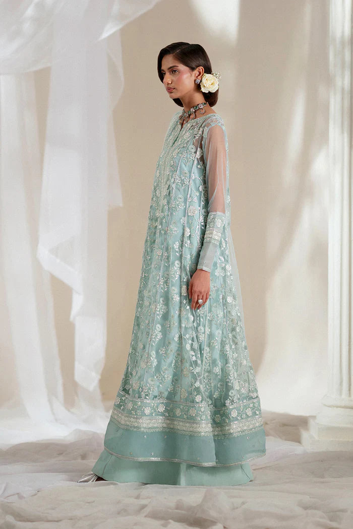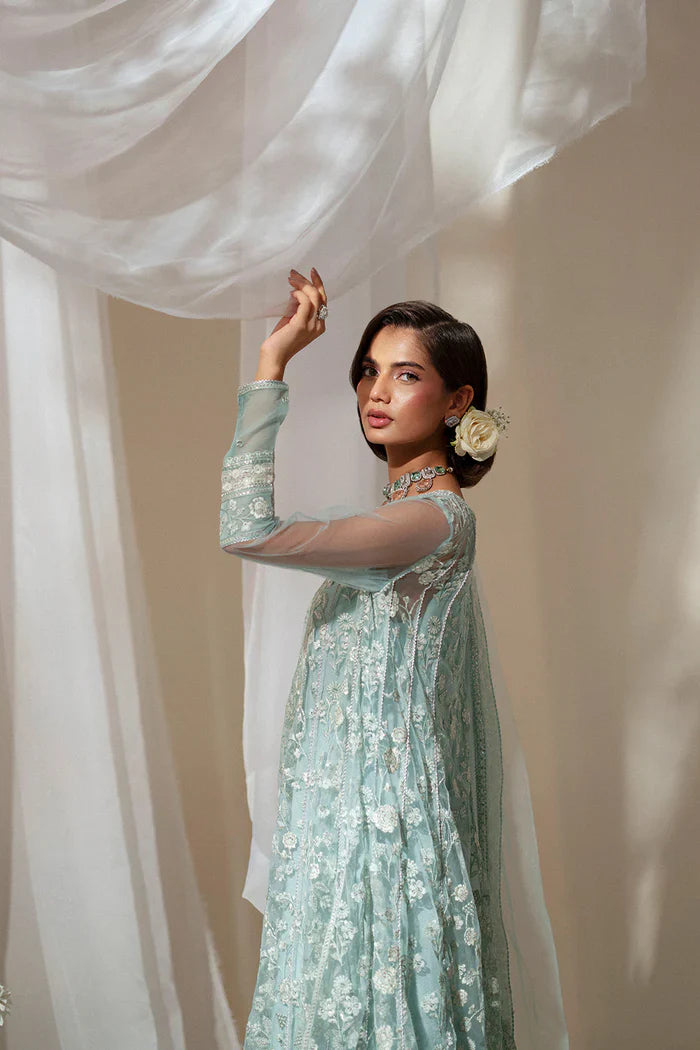 Gracefully designed in a serene Glacier hue, this 3-piece pret exudes timeless charm. The long A-line shirt with side flares is adorned with delicate all-over embroidery and shimmering sequins, complemented by a slit-V neckline with an intricately embroidered panel. Full-length sleeves with embroidered cuffs and lace detailing add a refined finish. The hemline is styled with an embroidered border, enhancing its elegance. Paired with straight wide-leg grip trousers featuring lace-detailed panels for a modern silhouette. The look is completed with a net dupatta, beautifully bordered on all four sides with intricate embroidery.