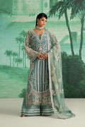 Radiating regal charm, this Blue Turquoise 3-piece pret is crafted in sheer organza with exquisite embroidery. The straight long shirt features a slightly scooped neckline with a keyhole slit, delicately finished with piping. Its surface is adorned with resham and zari floral vines, highlighted with symmetrical mirror work that adds timeless elegance. Full-length sleeves are richly embroidered till the cuffs, while the hem is graced with an ornate floral vine border finished with crystal pearl detailing. The flared grip trousers bring balance, detailed with lace trims and an embroidered organza border for added finesse. A breezy Bareeze Net dupatta completes the look, scattered with delicate floral motifs and framed with four-side embroidered borders. A graceful ensemble that blends tradition with contemporary sophistication.