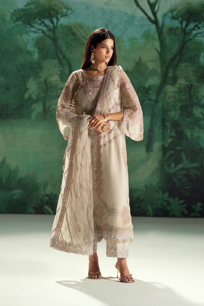 Step into refined elegance with this Silver Line 3-piece pret, crafted on delicate Bareeze Net. The straight round-neck shirt is adorned with vertical embroidered strips flowing gracefully from neckline to hem, enriched with continuous floral vine patterns and scalloped edges. A wide embroidered patch border, blending floral and geometric artistry, enhances the hemline, while a diamond-shaped central motif above the border adds a striking finish. The sleeves feature embroidered bands with a bold central floral motif, styled with a mid-sleeve triangular cut opening highlighted with intricate embroidery. Straight grip trousers are finished with embroidered borders at the hem, creating a sleek and polished look. The Bareeze Net dupatta elevates the ensemble with diagonal lattice embroidery shimmering with sequins, framed by four-sided embroidered borders and delicate lace detailing. A timeless statement that merges grace, detail, and modern sophistication.