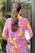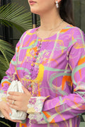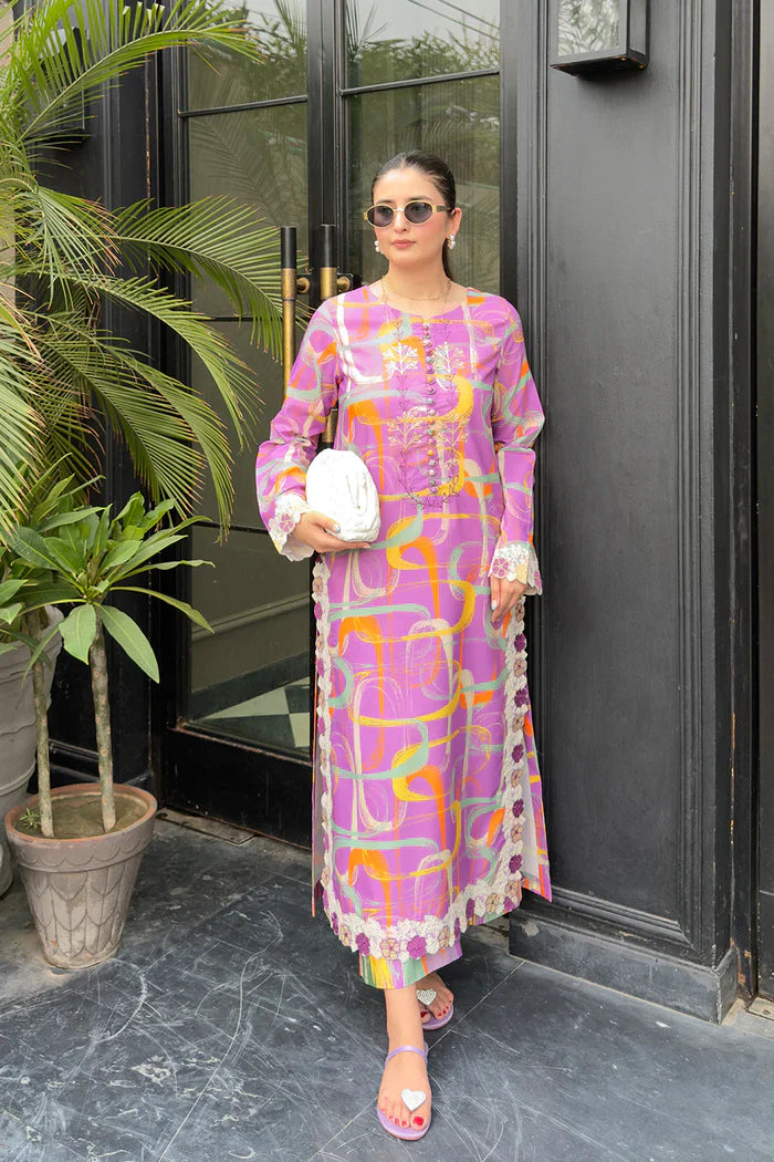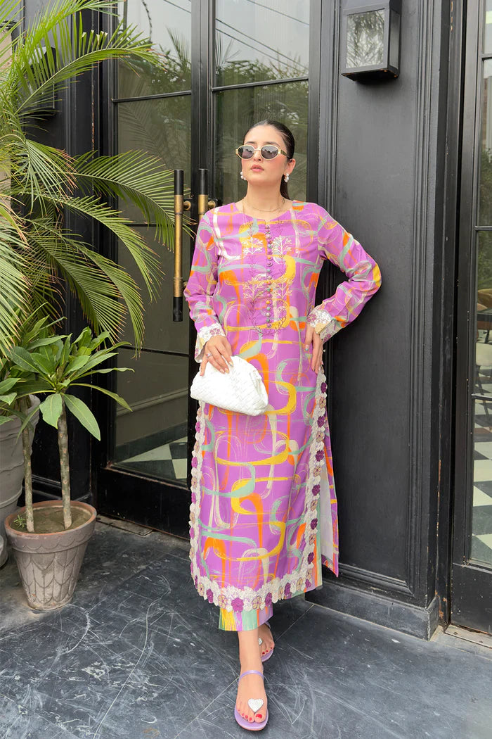 Add a touch of sophistication to your wardrobe with this 2-piece pret ensemble in the captivating shade of Ultra Violet. The shirt features a classic round neckline enhanced with loop button detailing for a subtle yet stylish accent. Fitted sleeves are adorned with elegant embroidered borders, while the scalloped embroidery on the side slits and hem adds a graceful finish. Paired with a straight contrast printed trouser, this look brings together timeless charm and contemporary flair — perfect for your seasonal style refresh.