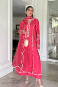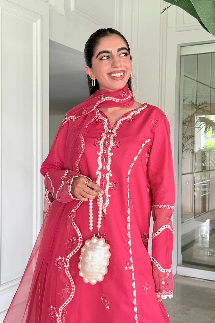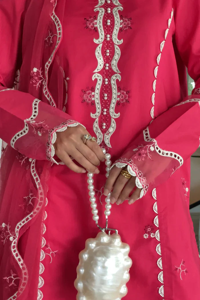 Turn heads in this Red 3-piece pret crafted in lawn with cambric cotton trouser and a Bareeze net dupatta. The straight-cut, long shirt features a V-shaped neckline with an embroidered placket, highlighted by elegant contrast white lace detailing. Full-length sleeves are enhanced with organza panel inserts, embroidered accents, and scalloped trims, adding a touch of sophistication. A straight hem with delicate lace detail complements the plain straight trouser for a timeless finish. The Bareeze net dupatta, adorned with embroidered floral motifs and scalloped edges in a contrasting tone, completes this graceful and refined ensemble.