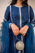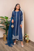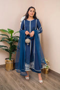Exude timeless elegance with this enchanting 3-piece pret in Blue, crafted to perfection for effortless style. The lawn shirt is designed with a classic boat neckline, featuring delicate embroidery and lace detailing on the side slit and hem for a graceful finish. Its fitted sleeves with intricate embroidery add a touch of sophistication. Paired with a flared dyed cambric cotton trouser, the outfit strikes the perfect balance between tradition and modern flair. The look is elevated with a net dupatta, beautifully framed with four-sided embroidered borders, making it a statement of refined charm. A versatile design that brings poise and elegance to festive gatherings or daytime occasions alike.