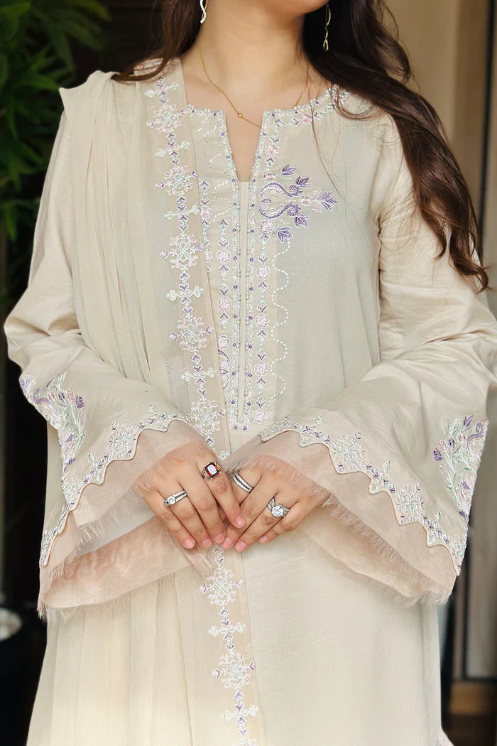Grace meets sophistication in this 3-piece pret in White Swan, designed to embody timeless charm. The lawn shirt features a refined round neckline with a front slit adorned with delicate pearl details, creating an aura of understated elegance. Embroidered flared sleeves with organza accents add a touch of graceful drama. The long shirt is beautifully detailed with embroidery along the side slit and hem, enhancing its feminine allure. Paired with a basic flared cambric cotton trouser, the outfit ensures comfort with elegance. The chiffon dupatta boasts 4-sided embroidered borders, finished with a captivating embroidered motif on the pallu for a statement finish. A versatile ensemble, perfect for festive gatherings and graceful evenings.