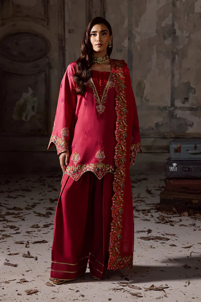 Make a bold statement with this 3-piece Pret in Urban Red, designed in premium Russian Silk for the shirt and shalwar, paired with a delicate Organza dupatta. The short-length shirt features a graceful V-neckline with pleated fabric and button detailing, adorned with intricate embroidery for a refined touch. An all-over embroidered spray enhances the shirt, finished with a beautifully scalloped embroidered hem. The full-length sleeves mirror the elegance with rich embroidery and scalloped detailing. A classic shalwar with lace accents on the hem adds traditional charm. Completing the look, the organza dupatta is framed with four-sided scalloped embroidered borders, making it the perfect ensemble for festive and semi-formal occasions.