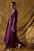 Grace your wardrobe with this 3-piece Pret in Mulberry, tailored in luxurious Russian Silk and paired with a delicate Organza dupatta. The shirt features a round embroidered neckline with a deep slit, finished with pleated organza facing for a refined touch. Elegant embroidery motifs on the front add a sophisticated charm, while the fully embroidered flared sleeves are detailed with lace edges for graceful finesse. Intricate lace detailing on the sides and hem further enhances the silhouette. A chic flared trouser with lace accents perfectly complements the ensemble. The look is completed with an ethereal organza dupatta, adorned with an all-over embroidery spray, bringing timeless elegance to every occasion.