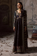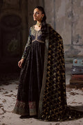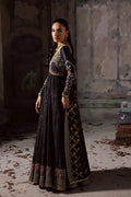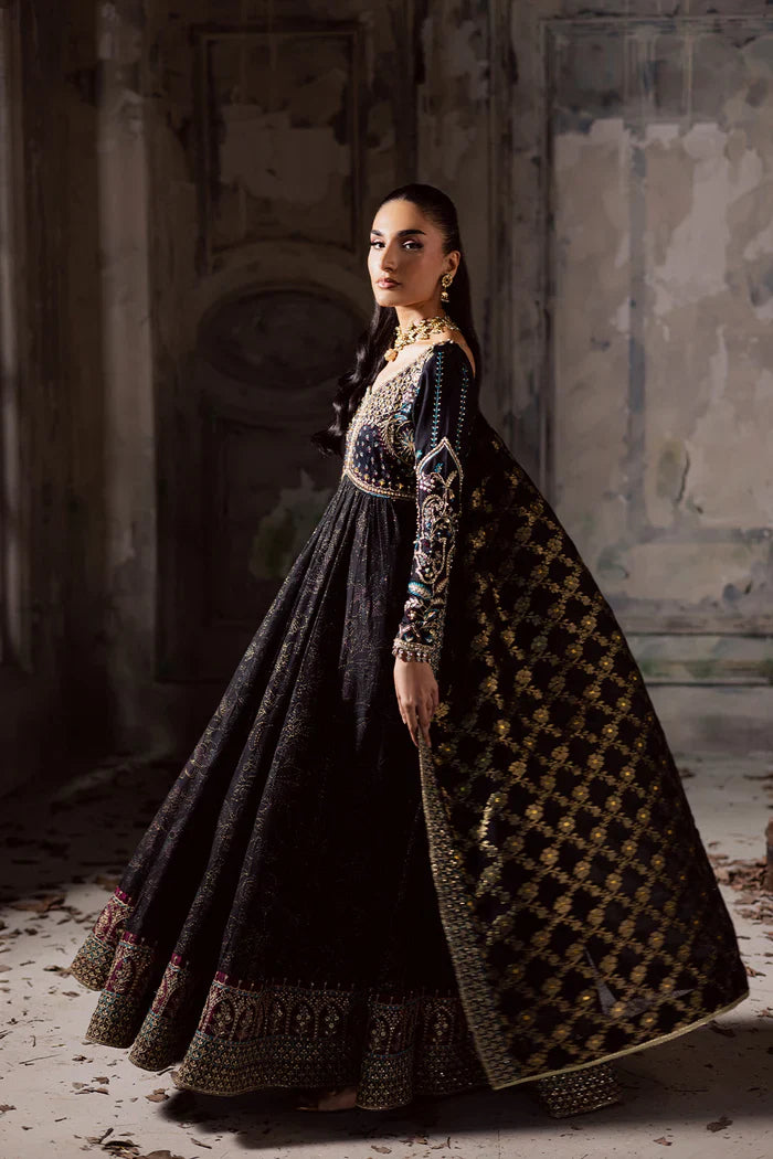 Turn heads with this regal 3-piece Pret in Black, crafted in rich Russian Silk with a graceful Cotton Net dupatta. The floor-length Anarkali gown features a broad U-neck bodice adorned with exquisite embroidery and adda work, creating a statement of timeless elegance. Its fitted sleeves are fully embroidered with adda detailing and finished with delicate pearl hangings on the cuffs. Flowing screen-printed flared panels are accentuated with contrast embroidered borders at the hem, both front and back, while chic tassel detailing on the back adds a playful charm. Paired with a sleek straight trouser for balance, the look is perfected with a screen foil-printed dupatta framed in embroidered borders. A masterpiece of sophistication, this ensemble is ideal for grand festive occasions.