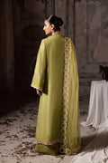Exude refined elegance in this 3-piece Pret in Avocado Green, crafted from premium Russian Silk with a graceful Bareeze Net dupatta. The straight long shirt showcases a V-neckline with embroidered scalloped borders, enhanced by a delicate floral embroidery motif bunch at the front. Intricate lace detailing on the front panels and a scalloped embroidered hem bring a touch of sophistication. The full-length sleeves are adorned with wide embroidered cuffs and scalloped finishing for added charm. Flowing flared trousers balance the ensemble with modern flair. The look is completed with a net dupatta, designed with four-sided scalloped embroidered borders, making it perfect for festive and semi-formal occasions.