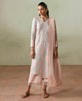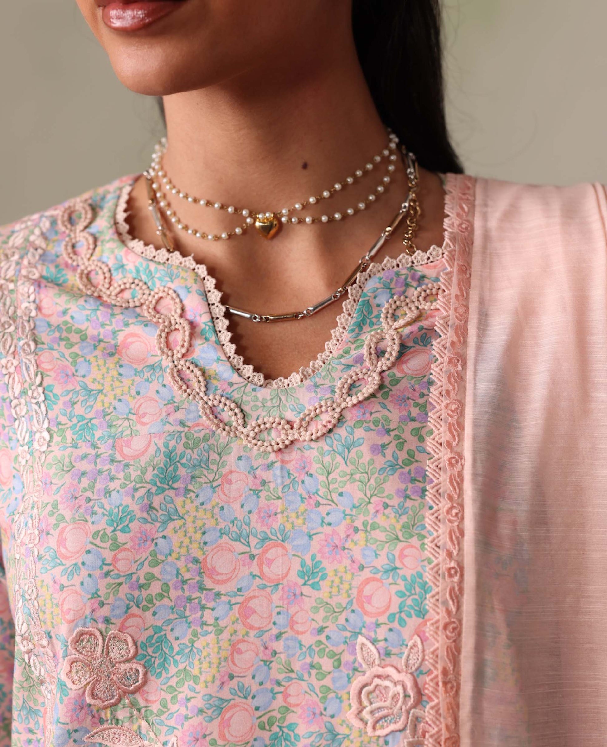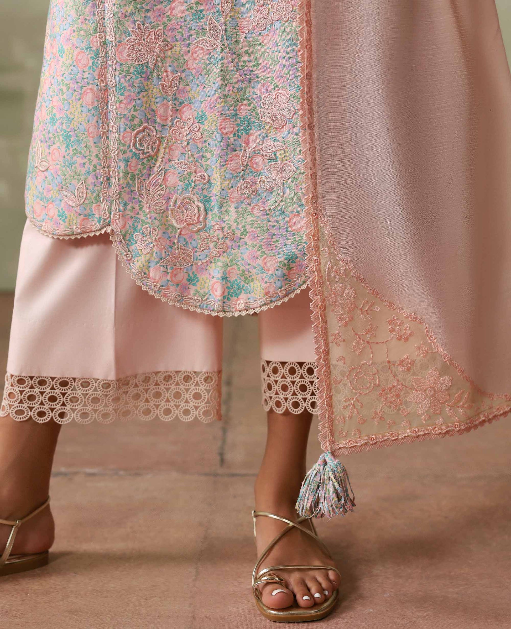 A playful lawn printed shirt designed and elevated with beautiful contrast embroidery and statement scalloped details. Paired with detailed trousers and a slub monar dupatta finished with contrast edges and delicate embroidery for a fresh, chic summer look.