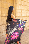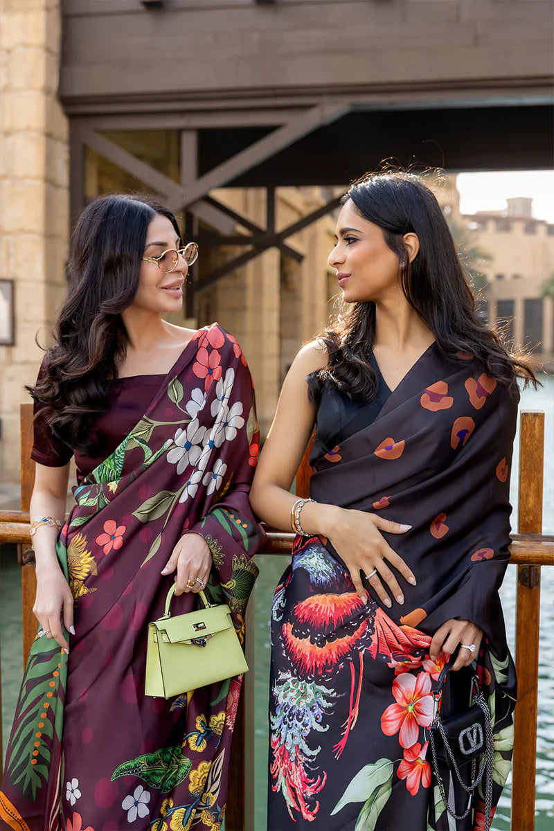The contrasting Wild flora and fauna prints that adorn 'Eniola' channel the vivid imagery of African wildlife scenes with quirky elements in shades of berry, moss, buff, sandstone, ivory and scarlet with tinges of cerulean and azure to enhance the deep ebony base. Paired with a sumptuous navy blouse, this spectacular design will serve as an expression of effortless glamour.