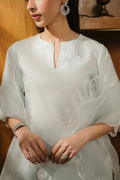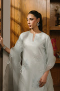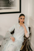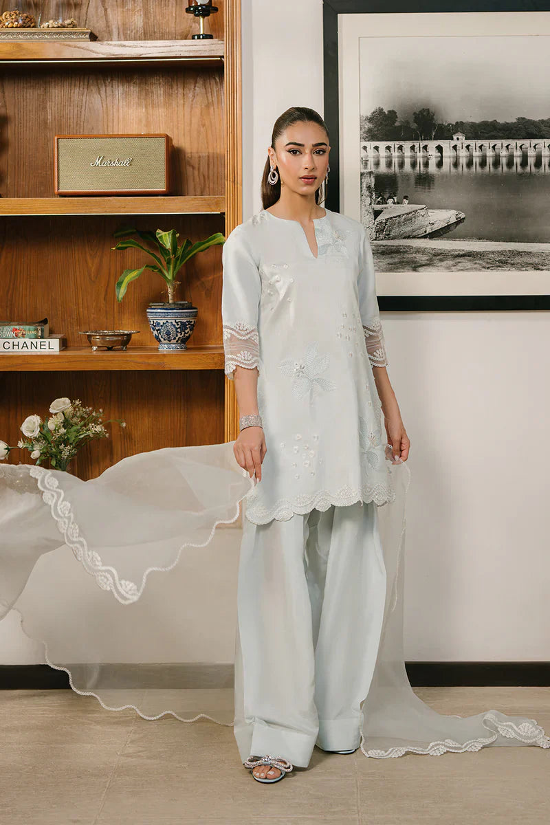 A dreamy ice blue canvas with subtle embroidery and delicate cutwork on pure silk, paired with a graceful farshi shalwar and a radiant cutwork organza dupatta—effortless elegance at its finest.