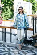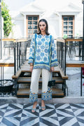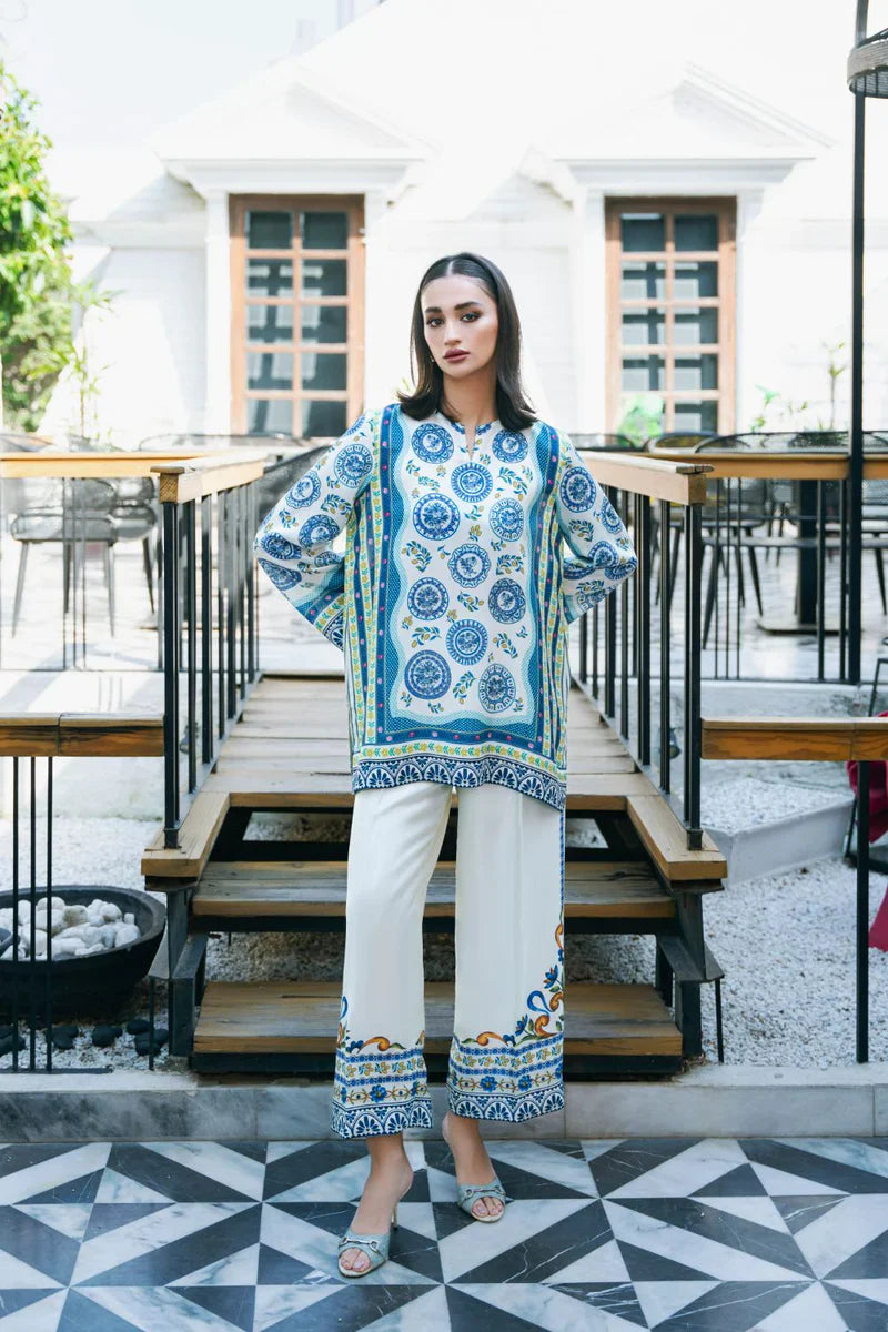 This silk co-ord set is a vibrant blend of colours and shapes, featuring a playful mix of floral and circular motifs which is paired with printed trousers. Perfect for a stylish day, this ensemble is the epitome of elegance and charm.