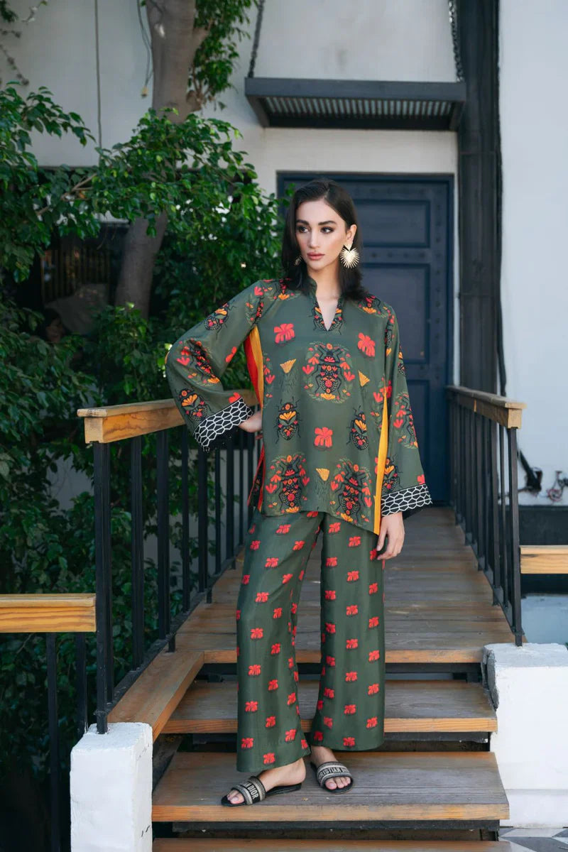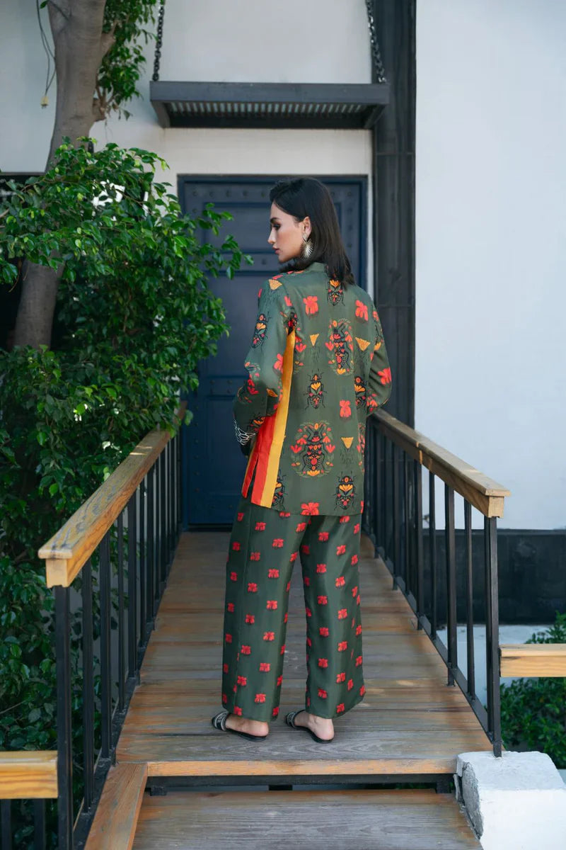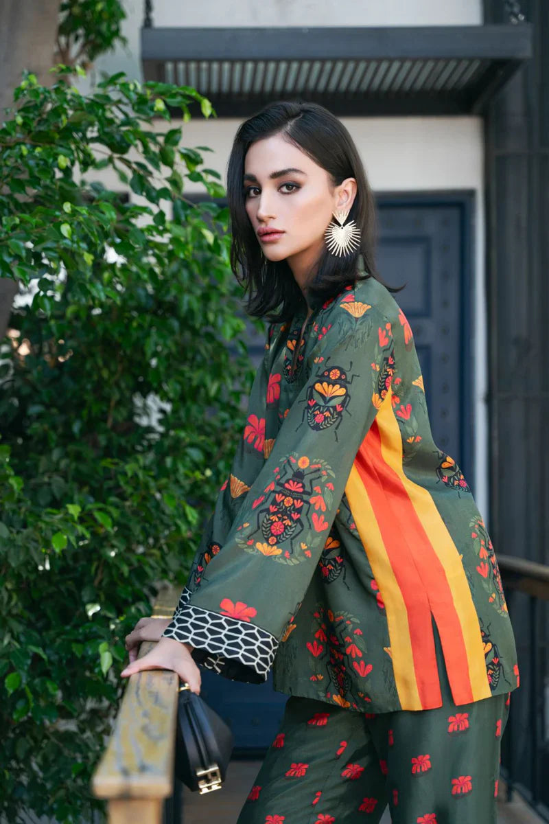 This co-ord set bursts with vibrant colours, evoking a sense of energy through its playful beetle and floral prints. A perfect blend of effortless style and chic elegance, this ensemble is a true statement piece.
