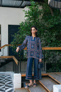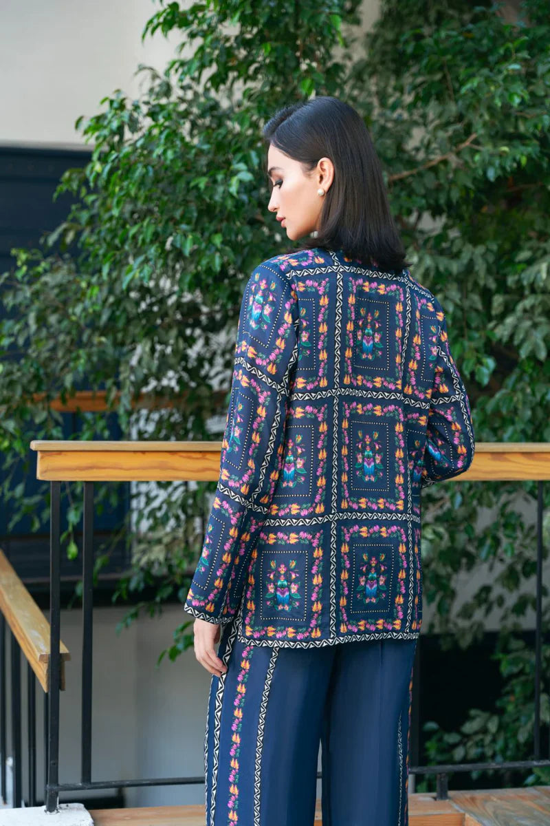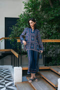 A deep blue silk co-ord set, featuring a whimsical blend of nature inspired prints with beetles and florals adorning the shirt. Paired with matching printed trousers, this set effortlessly balances playfulness and sophistication.