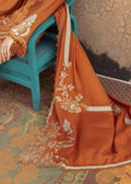 A breathtaking fusion of winter’s elegance and artistic craftsmanship, where a rich tangerine canvas serves as the foundation for an exquisite design. An ode to the classic Kashmiri embroidery. The shirt is adorned with intricate paisleys and floral motifs in a harmonious blend of ivory, burnt orange and sage. Each hue thoughtfully selected to evoke the spirit of ethnic culture and timeless artistry. Paired with a luxurious teal woollen shawl, delicately detailed on organza, floral bunch motifs adding a modern twist to a classic masterpiece that transcends fashion. It is a visual symphony of warmth, capturing the essence of winter's elegance and heritage.