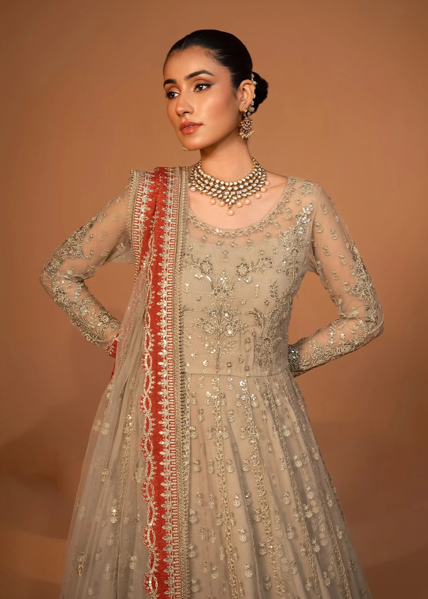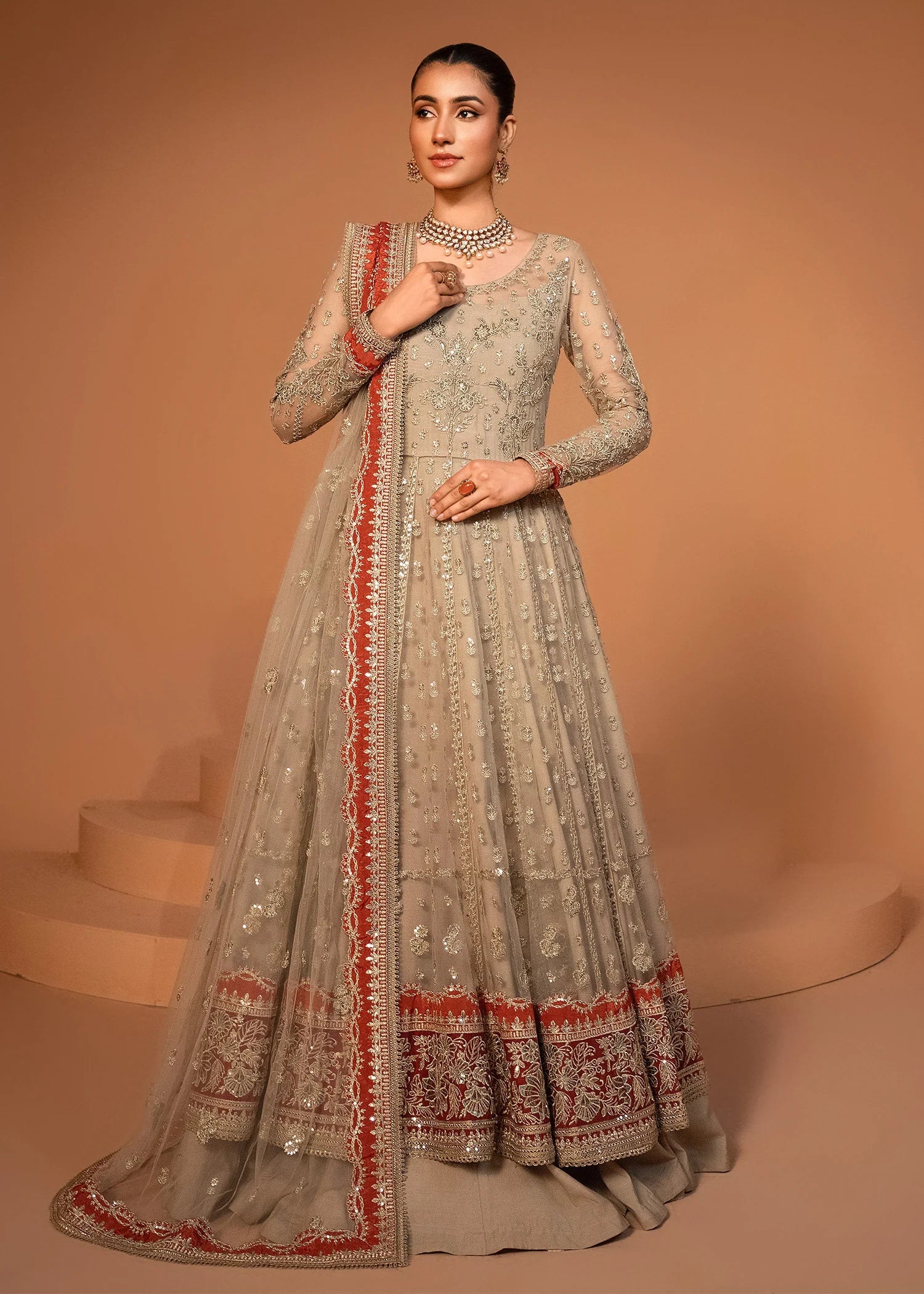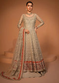 This stunning pishwas is adorned with intricate embroidery all over, creating a breathtaking display of artistry. The voluminous silhouette flows gracefully, while the embroidered net dupatta, featuring an all-over spray, adds a touch of ethereal charm. Paired with a luxurious silk lehenga, this ensemble perfectly blends elegance and grandeur, making it an ideal choice for weddings, festive, and formal events.