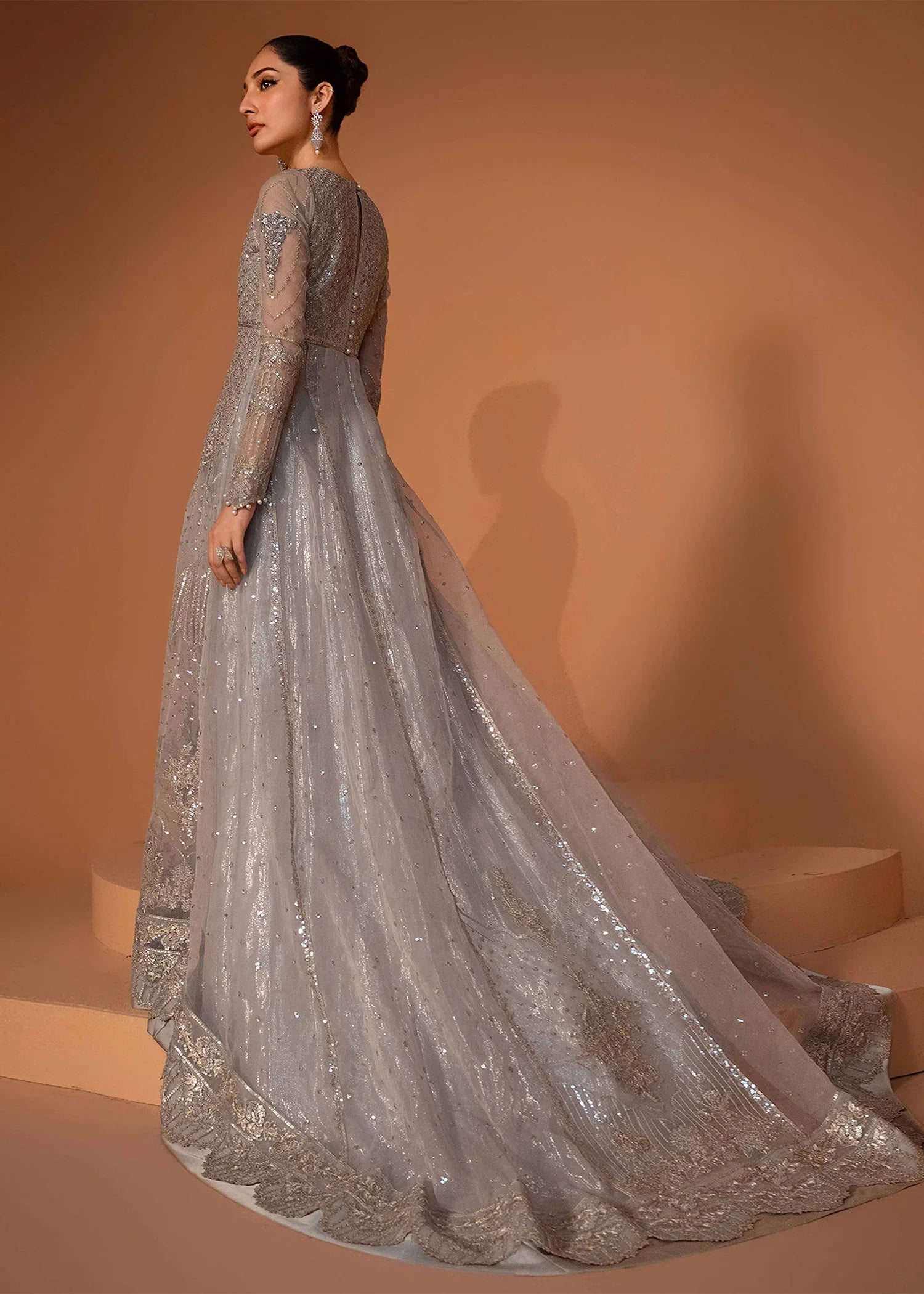 Adorned with detailed embroidery and shimmering sequins all over, this pishwas exudes refined elegance. The flowing tail design pairs beautifully with the embroidered organza dupatta, featuring an all-over spray for added grace. Ideal for grand occasions, this ensemble promises a lasting impression.
