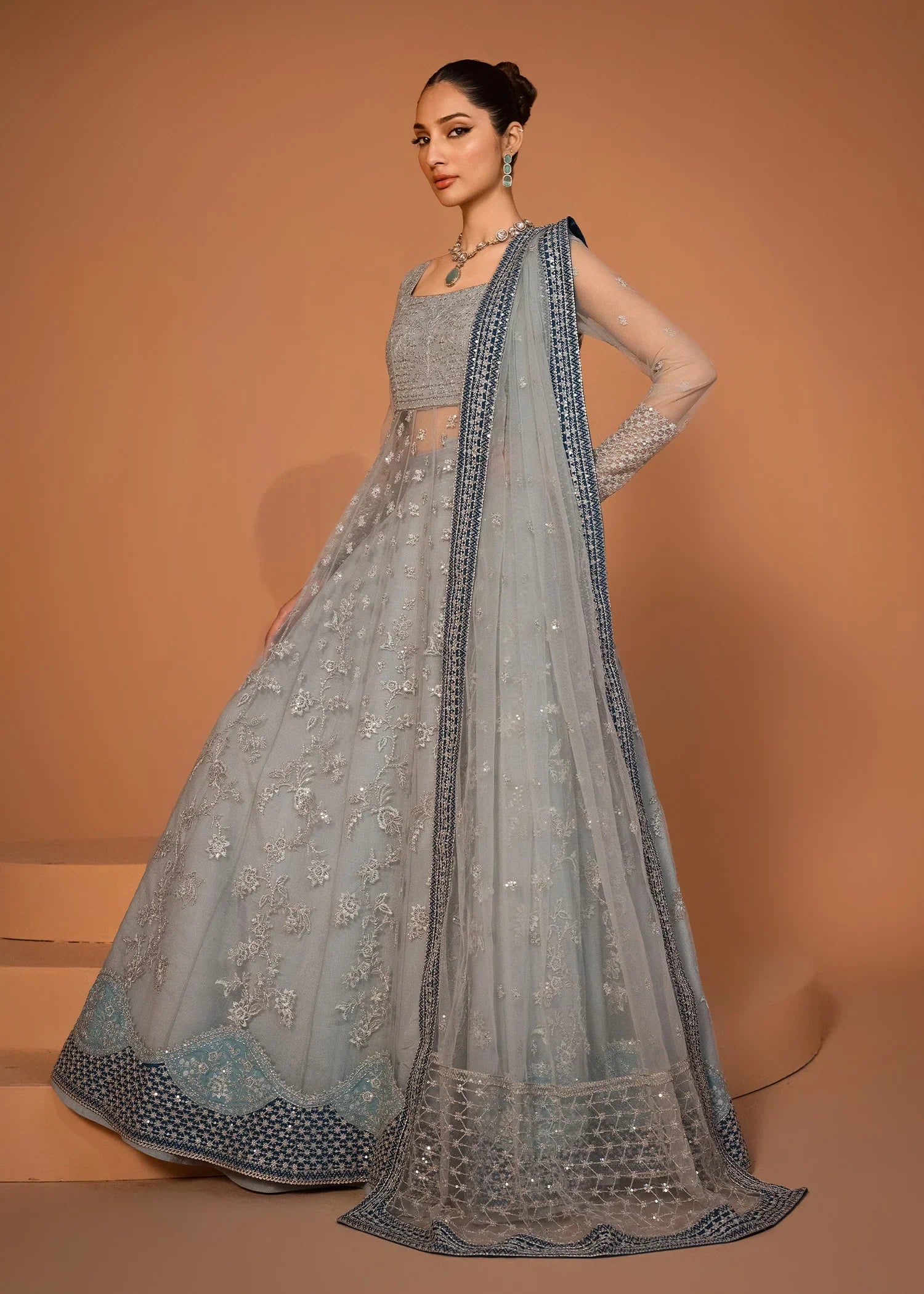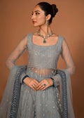 This exquisite pishwas features intricate embroidery cascading across the entire gown, blending tradition with contemporary charm. The outfit is elevated by a delicately embroidered net dupatta adorned with an all-over spray, adding subtle elegance. Paired with a flowing silk lehenga, this ensemble offers a perfect fusion of grace and grandeur. Designed for weddings and for special occasions, it promises to captivate with its regal silhouette and flawless craftsmanship.