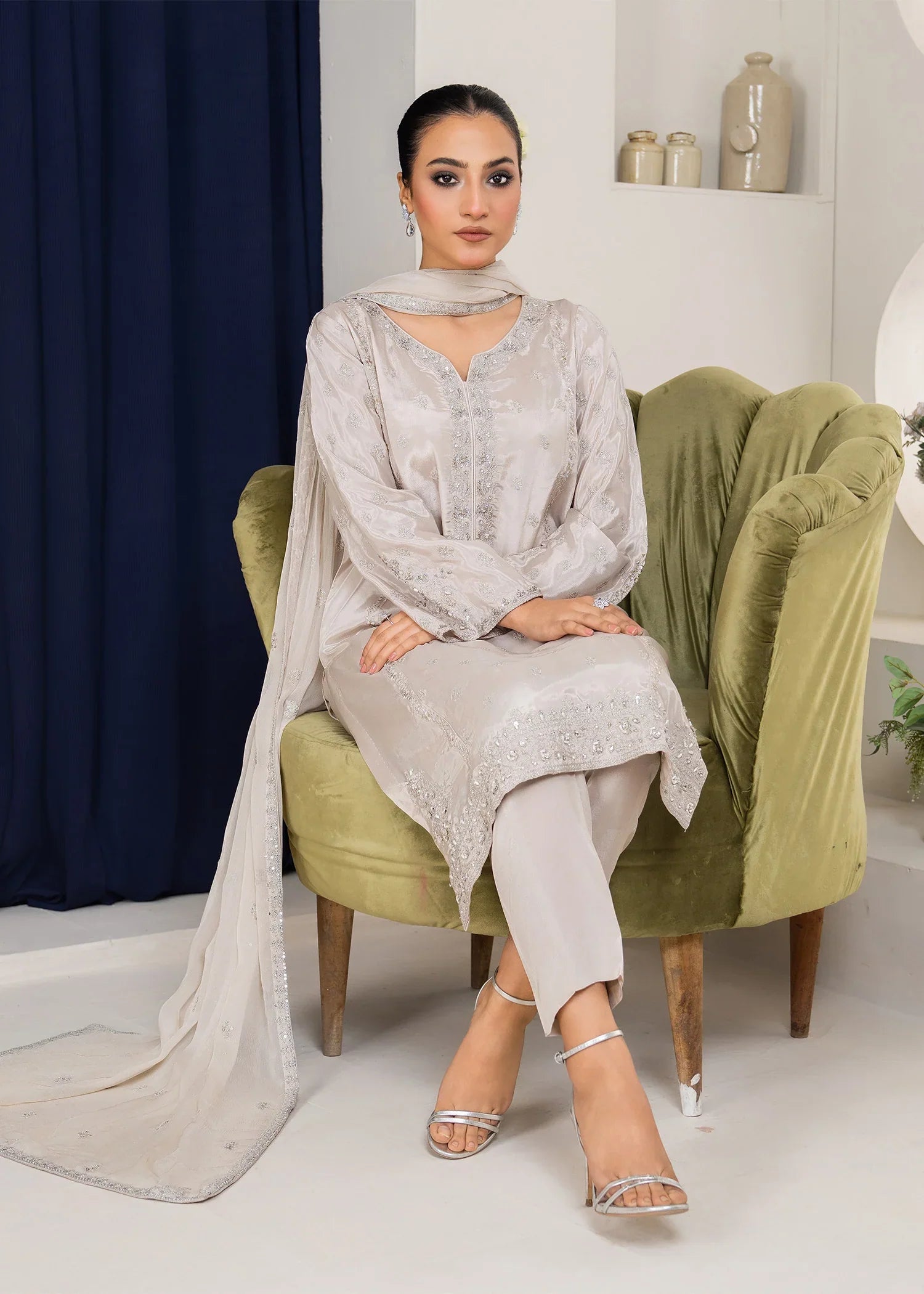 This luxurious ensemble is crafted from rich Russian silk, featuring exquisite embroidery and hand embellishments along the neckline and sleeve borders. The shirt is further adorned with delicate embroidered sprays all over, adding a refined touch. Paired with an embroidered crinkle dupatta and silk trousers, this outfit exudes sophistication and elegance, perfect for any special occasion.