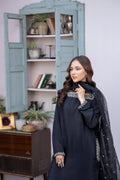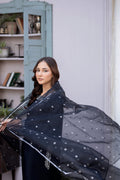 This black outfit is beautifully crafted with handwork embellishment on neck line and side pockets paired with net dupatta and embroidered silk trousers.