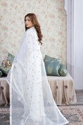 This elegant silk outfit is embroidered in threads and tilla with intricate hand embellishment on its borders to enhance it paired with embroidered organza dupatta and crushed sharara pents.