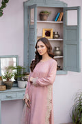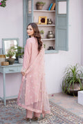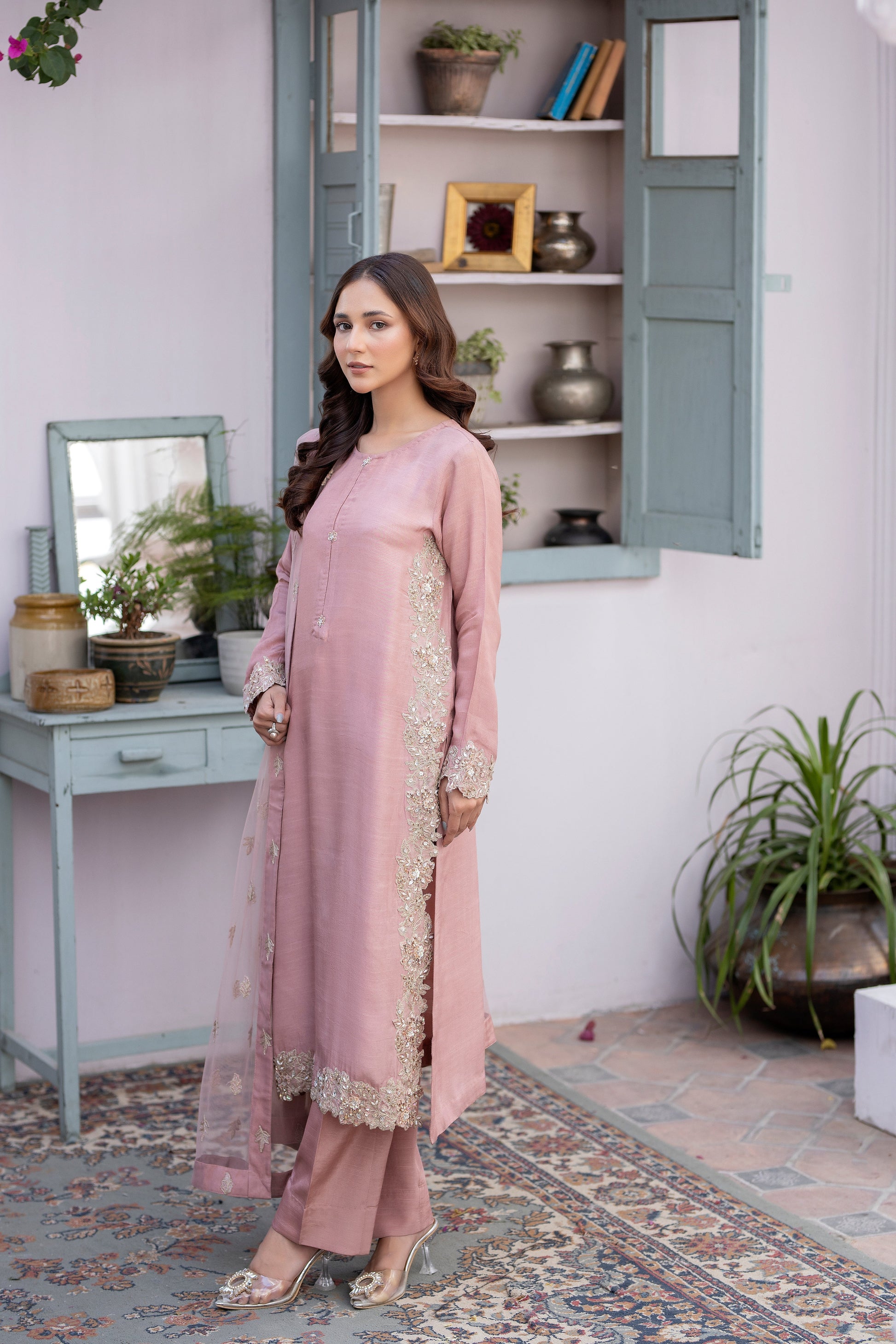 This silk outfit is embroidered in thread and tilla with hand embellished neckline, paired with net dupatta and silk trousers.