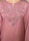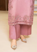An elegant ensemble crafted from luxurious Korean silk, featuring intricate embroidery and hand embellishments on the neckline, sleeves, and side slits. The design is elevated with organza borders on the front and back, paired with a crinkle dupatta adorned with embroidery and an all-over spray, and matching silk trousers. A perfect choice for timeless sophistication.