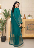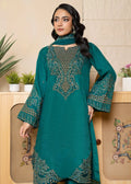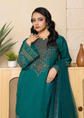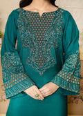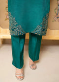 A sophisticated ensemble in luxurious Korean silk, showcasing intricate and detailed embroidery with hand embellishments on the neckline and sleeves. The design is elevated by a beautifully hand-embellished organza border, paired with a net dupatta featuring embroidered borders and an all-over spray. The look is completed with matching trousers, creating a refined and stylish outfit for any occasion.