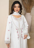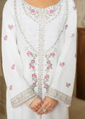 A stunning open-shirt ensemble crafted from luxurious raw silk, featuring intricate embroidery and hand embellishments on the neckline, sleeve borders, and a beautifully hand-embellished shirt border. The shirt is further adorned with delicate floral patterns and an all-over spray on the sleeves. Paired with a crinkle dupatta showcasing embroidered borders and all-over spray, along with matching trousers, this outfit is a perfect blend of artistry and charm.