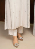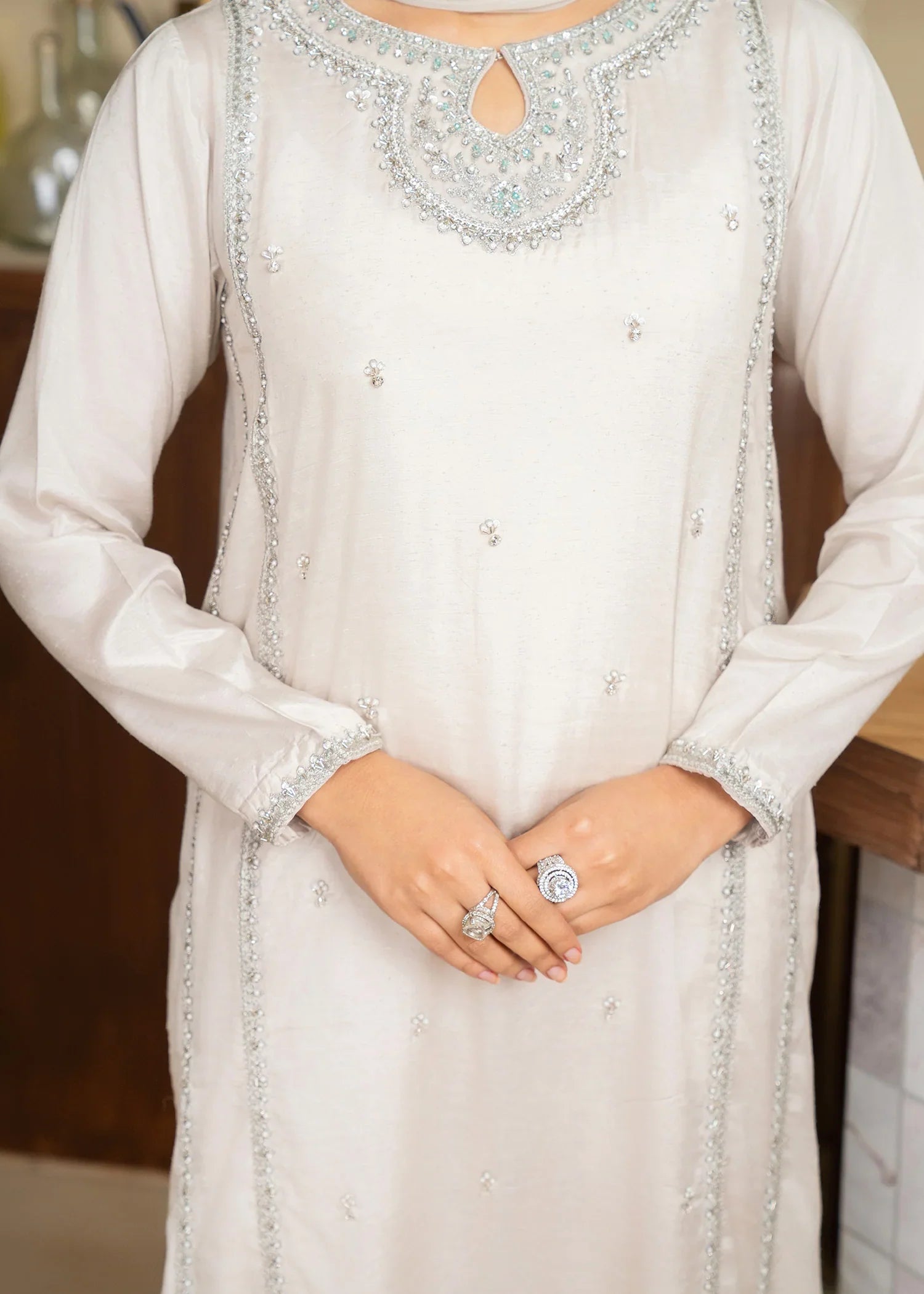 A beautifully crafted ensemble in luxurious Karandi silk, featuring exquisite embroidery and hand embellishments on the neckline, sleeve borders, and side panels. The shirt is enhanced with an elegant all-over spray, while the embroidered chiffon dupatta with matching spray and trousers complete the look. This outfit exudes timeless elegance and sophistication.