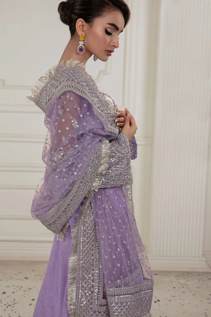 Korean Rawsilk hand embellished shirt with Korean Rawsilk hand embellished trouser paired with embroidered net embroidered dupatta Finished with Kiran lace and crystal tassels.