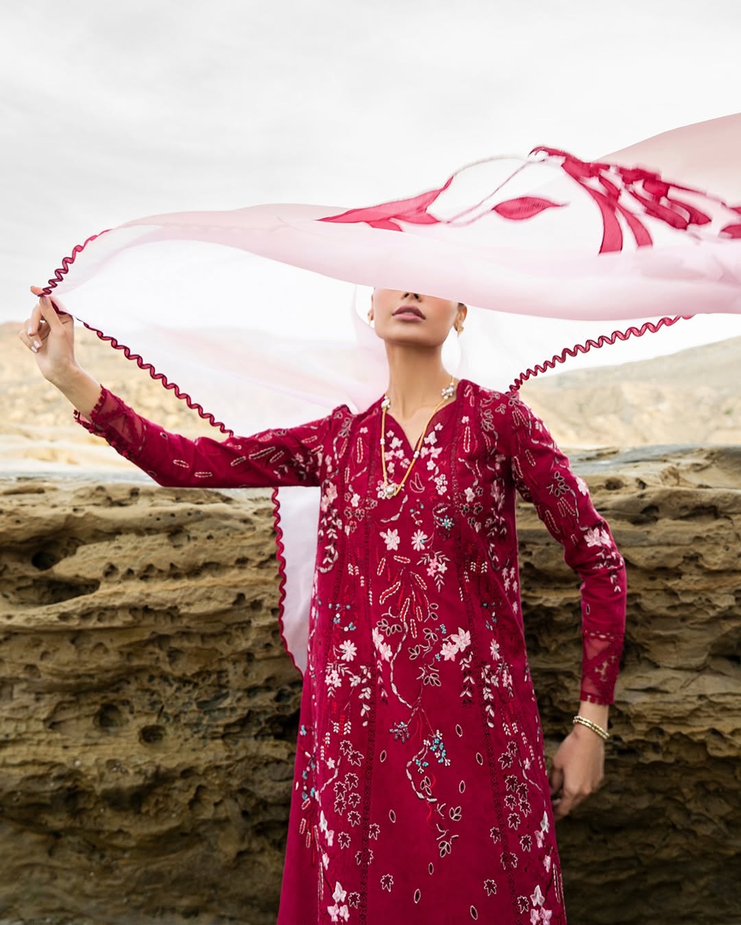 The breezy organza dupatta, adorned with intricate silk appliqu?? and a rich floral border, adds a touch of festive flair. With a palette of tangerine huesŸ??rust, pink, teal and tangerine huesŸ??this outfit is designed to make you the center of attention at any celebration!Ÿ?�